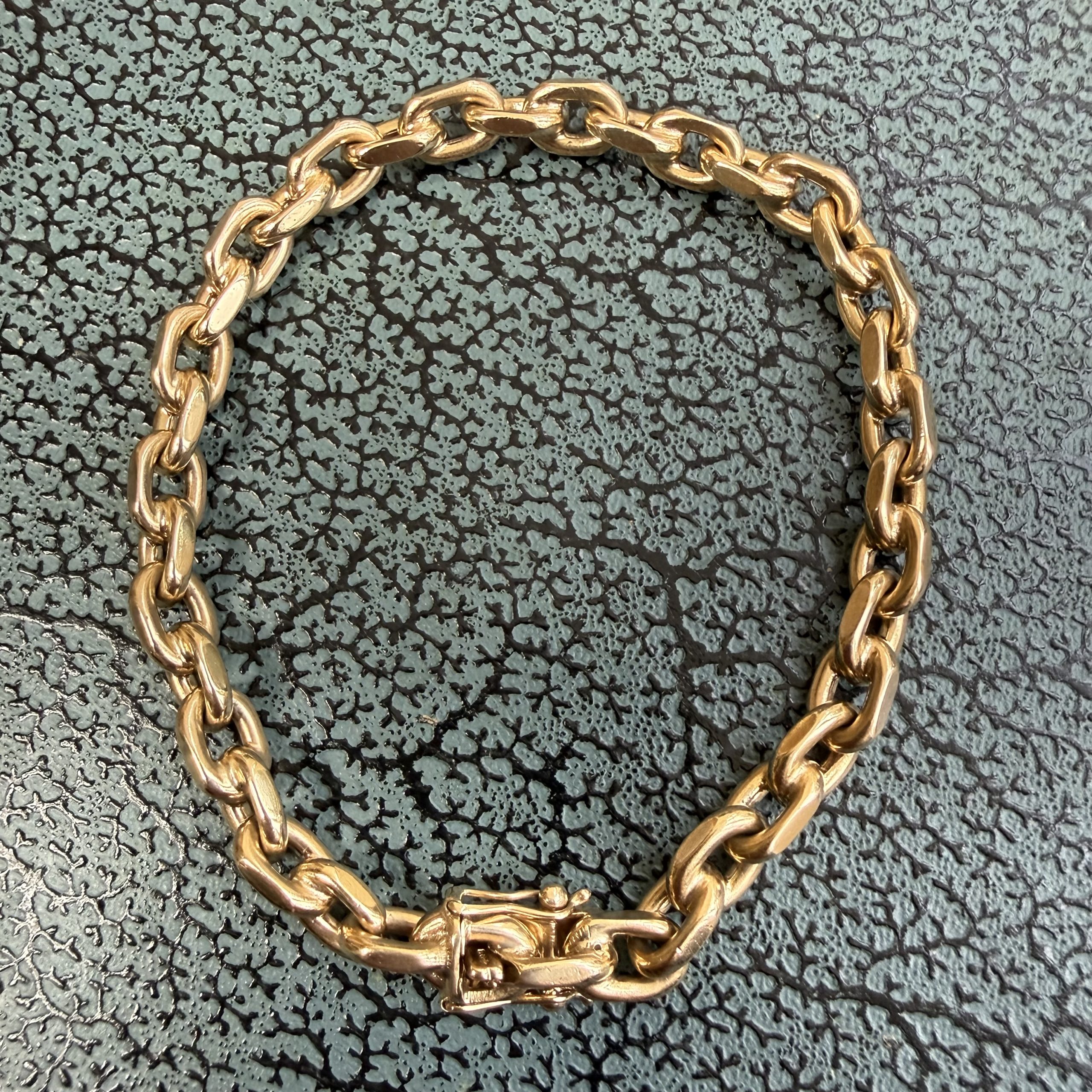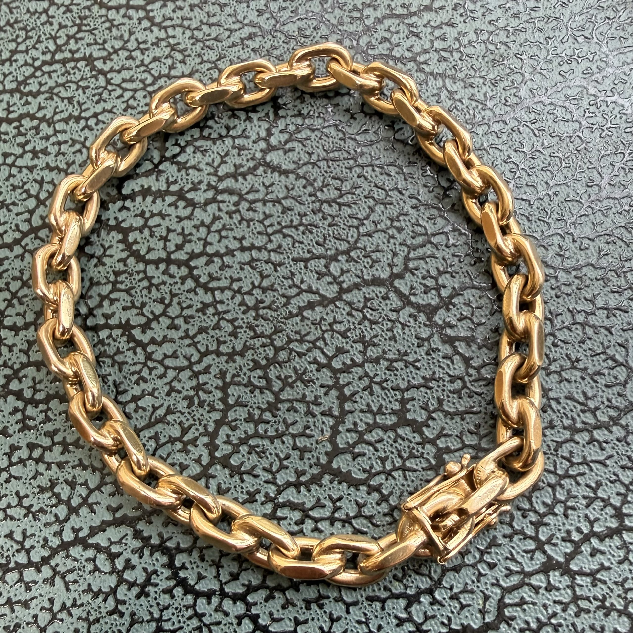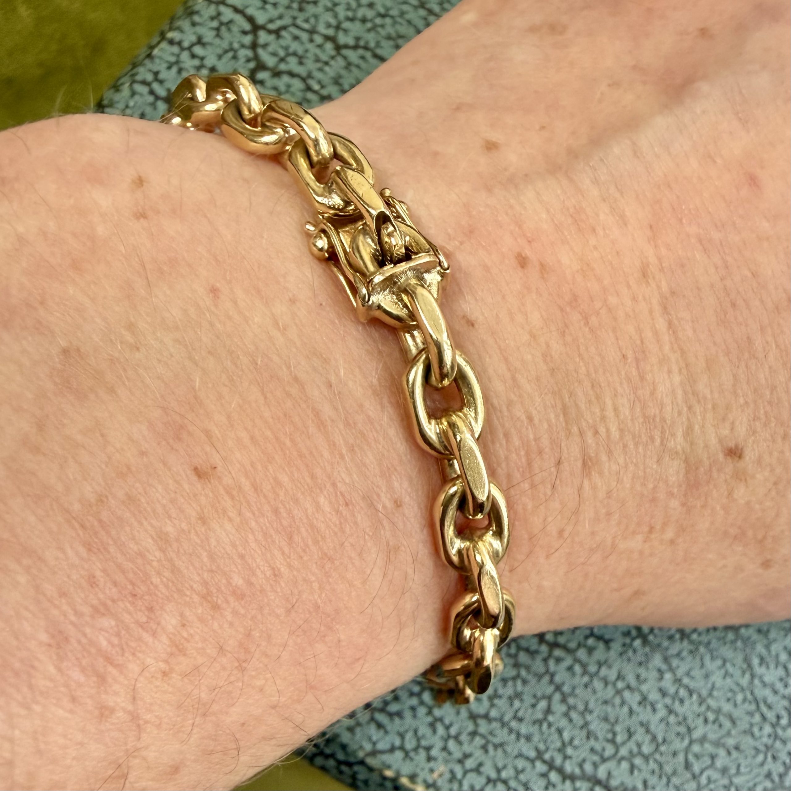 A modern classic boasting solid 9ct yellow biker links, in excellent condition with a super secure fastening