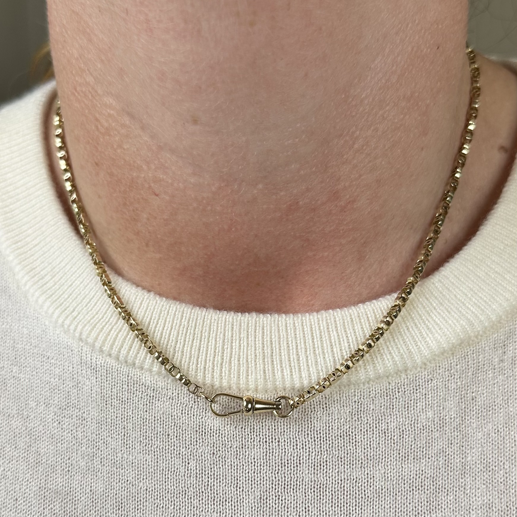 The chain is crafted in buttery true yellow 15ct gold and the dog clip is 18ct gold, which matches very well