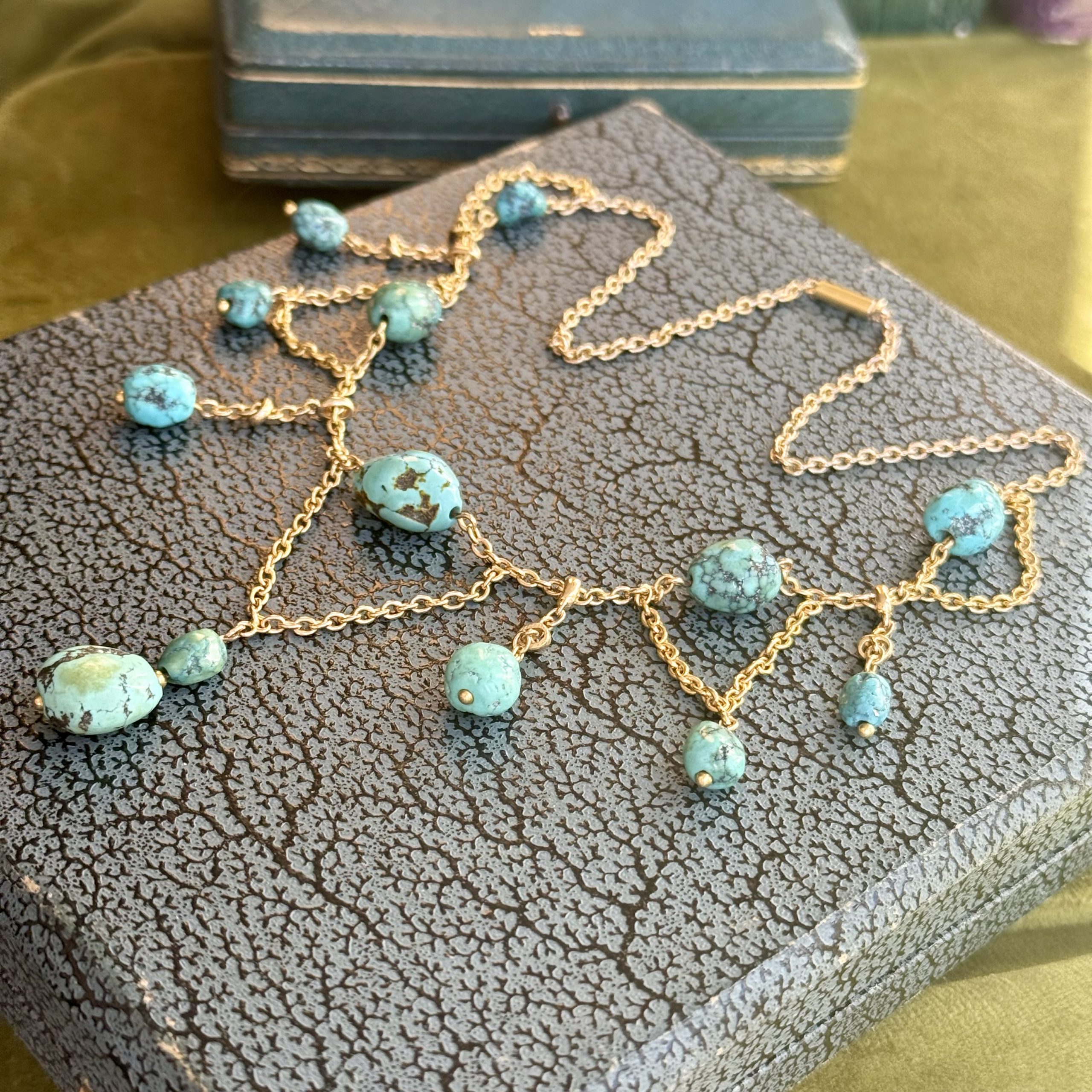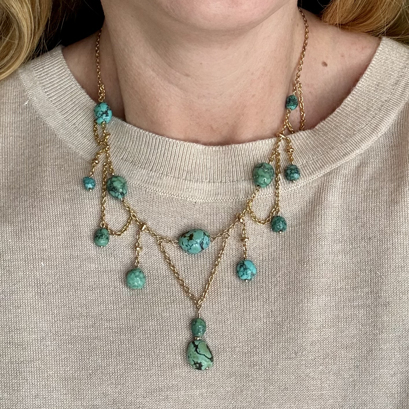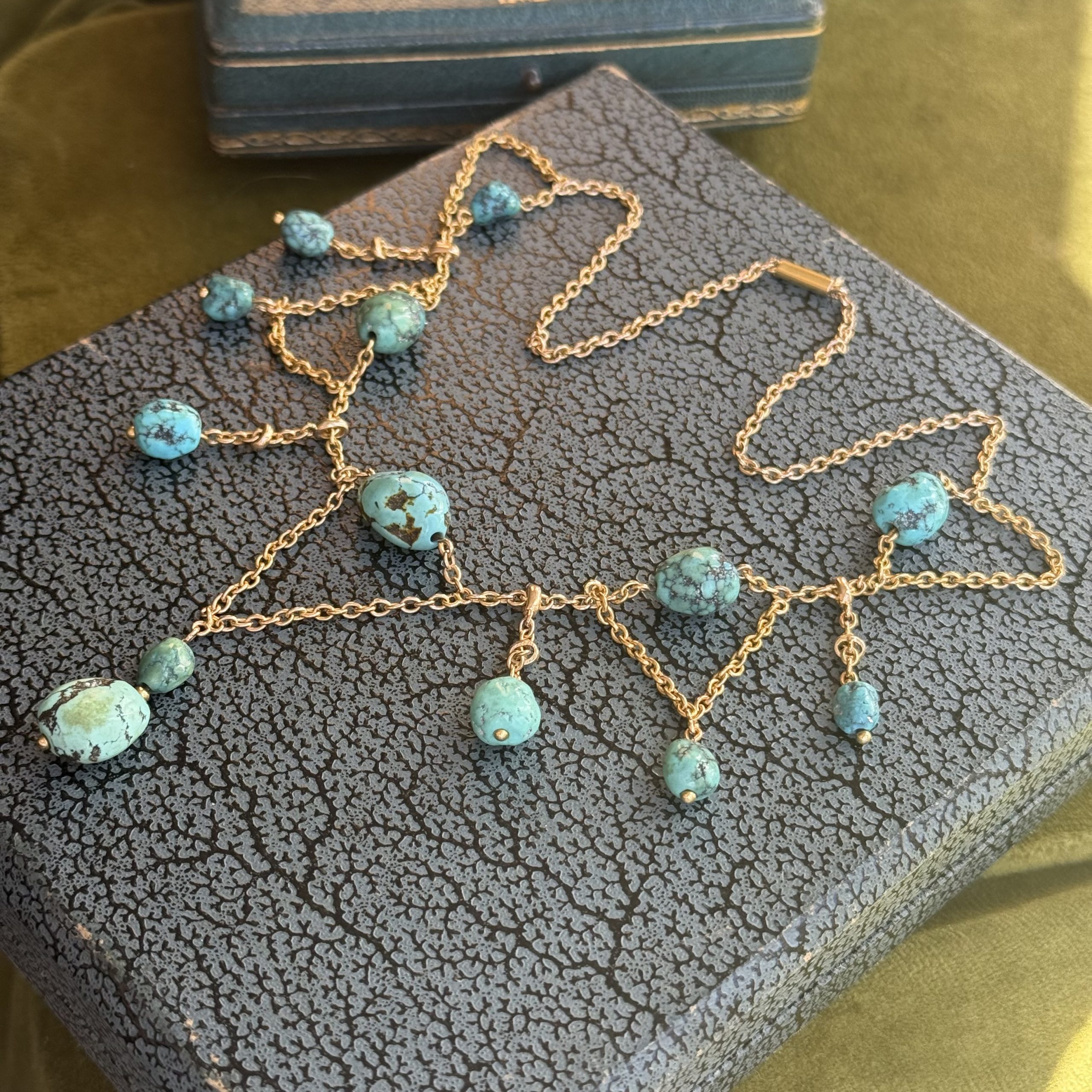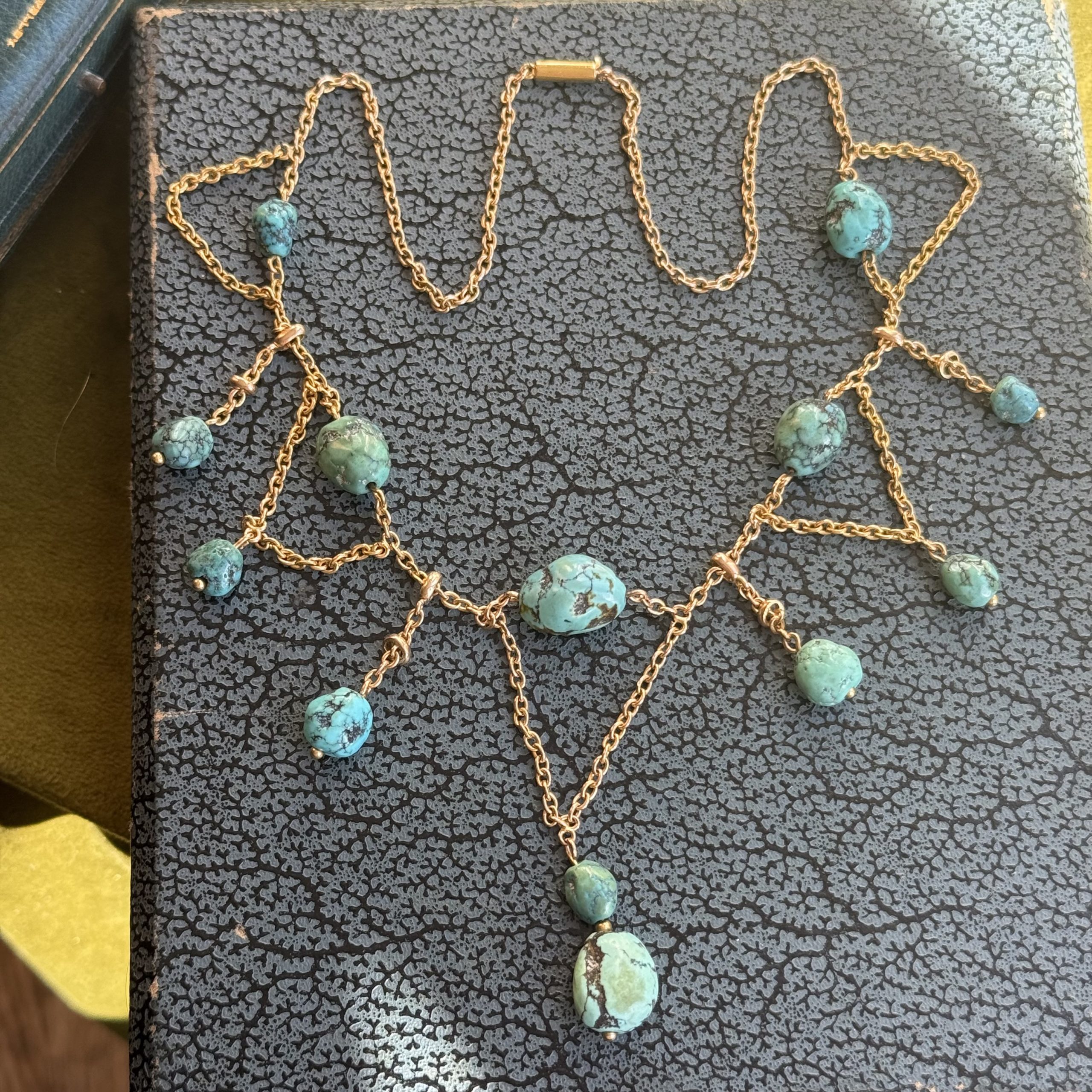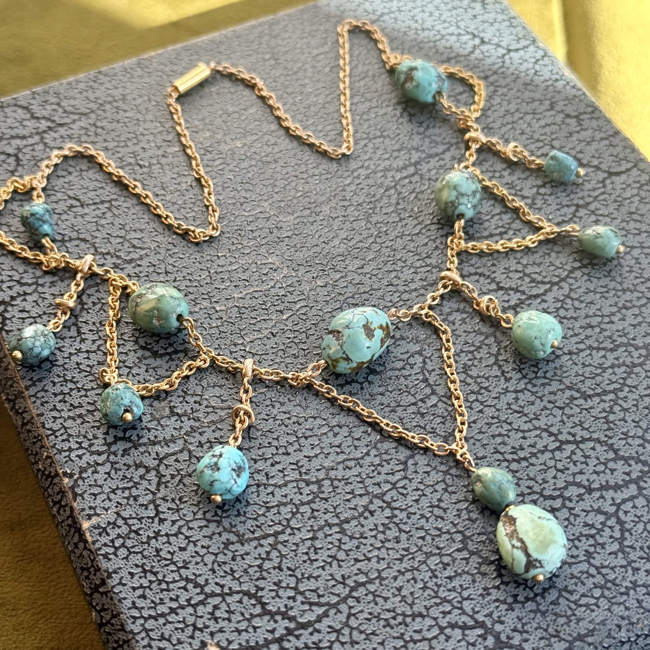 A Victorian swag or festoon necklace in 15ct gold and natural Persian matrix turquoise