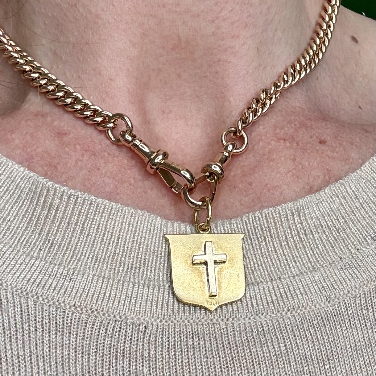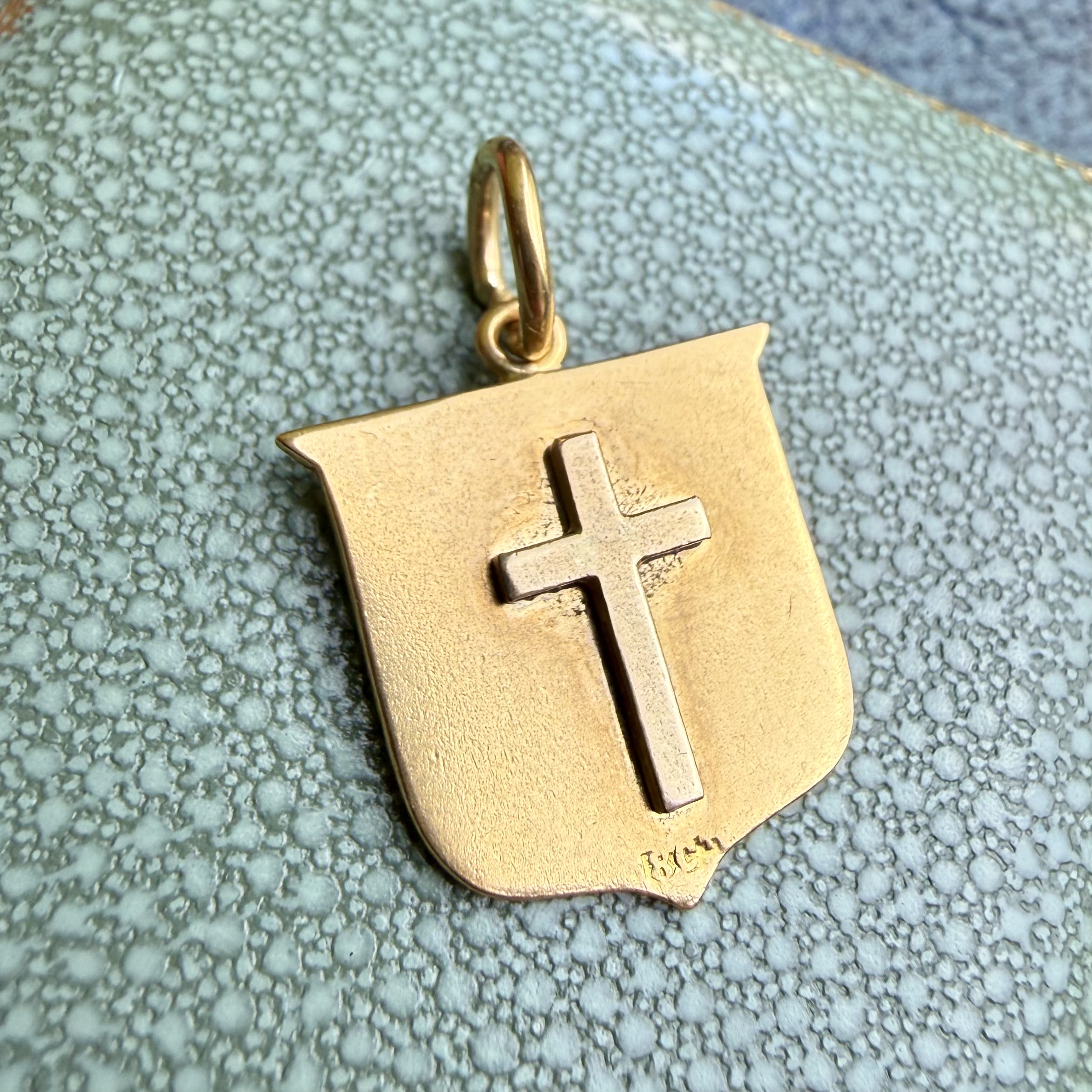 | Hallmarks | The applied crucifix is stamped for antique 9ct gold and has been added to the shield, The shield is stamped 18ct gold |