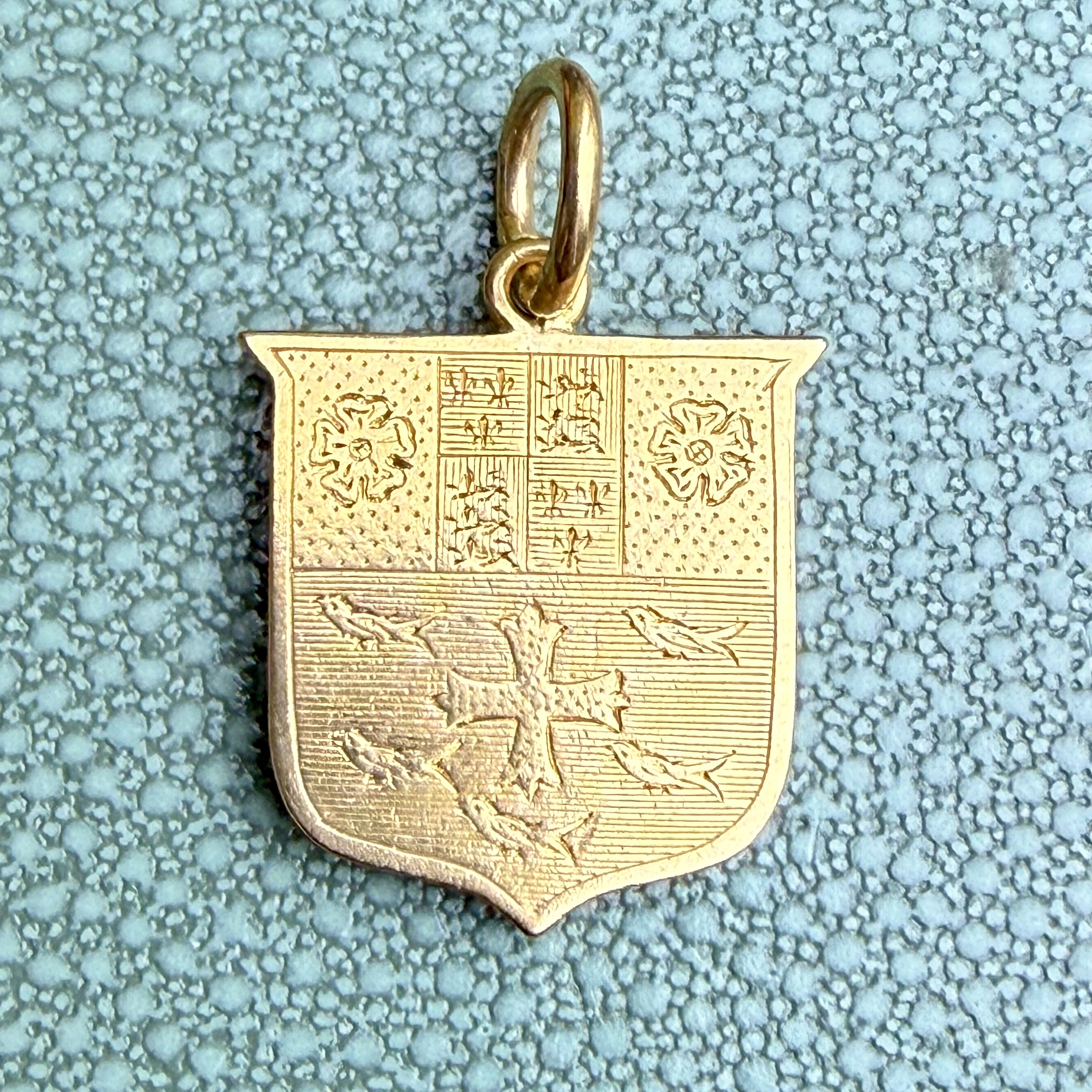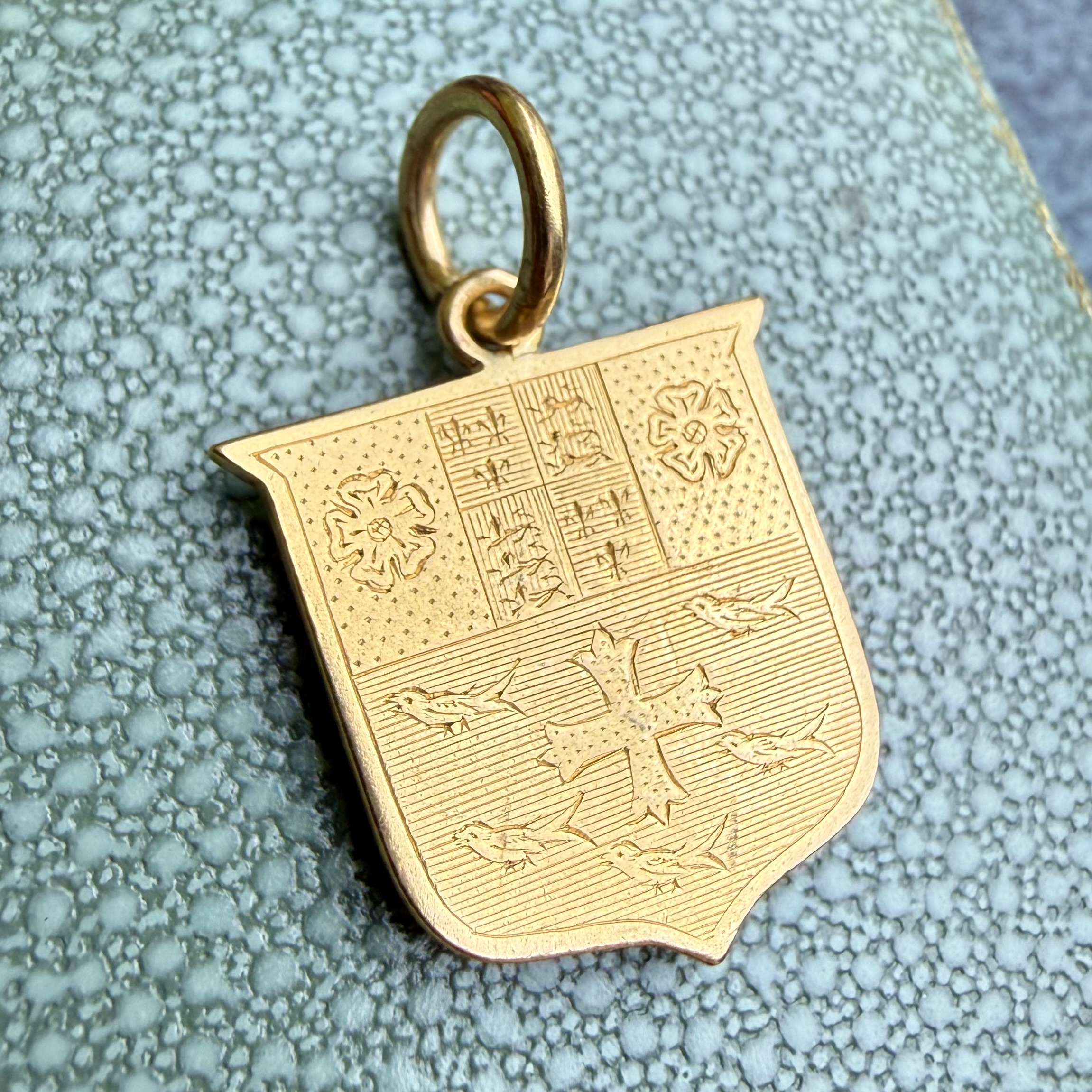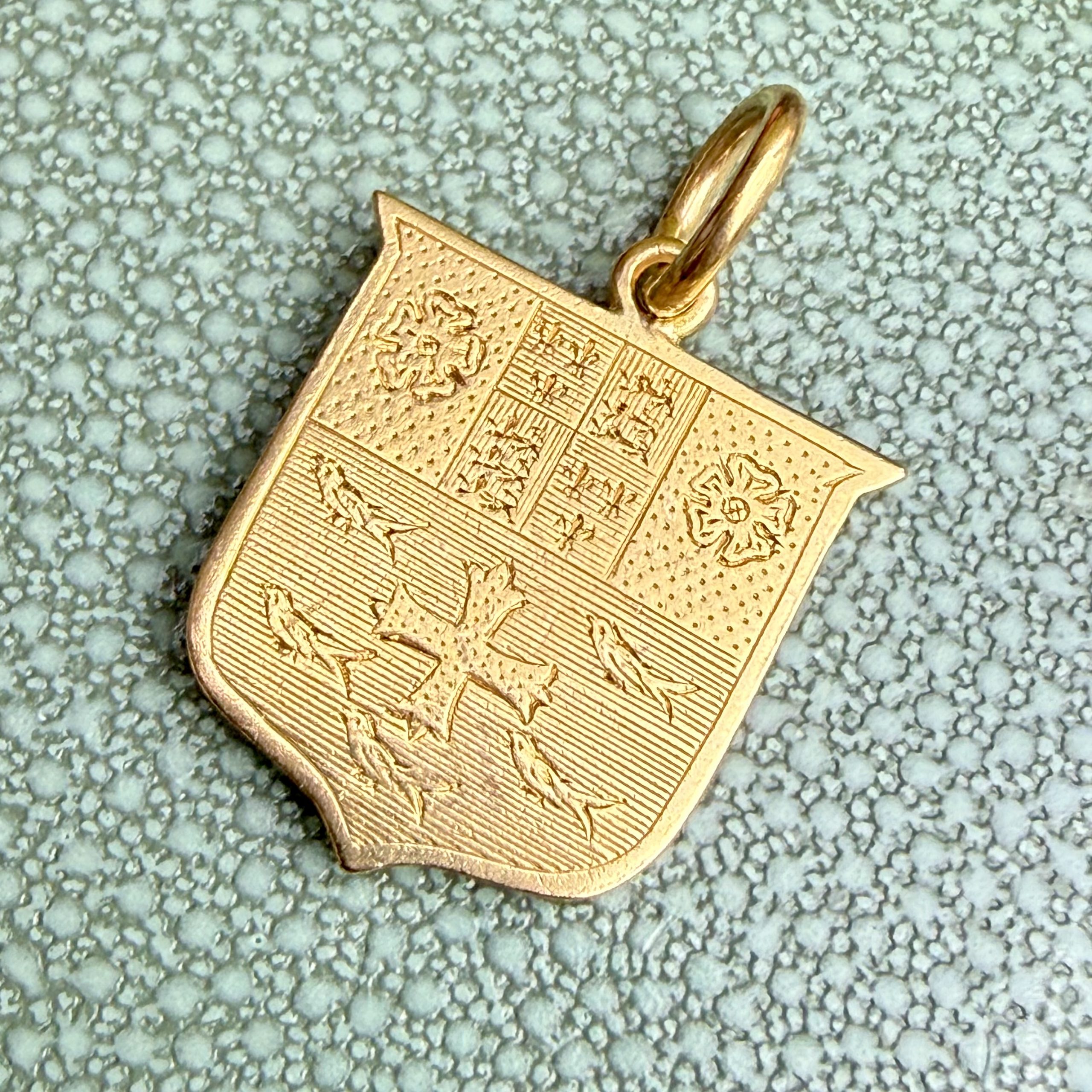 A fierce gold heraldic shield pendant in 18ct gold with the most wonderful hand engraved heraldic detail featuring birds, roses, fleur de lys and lions passant