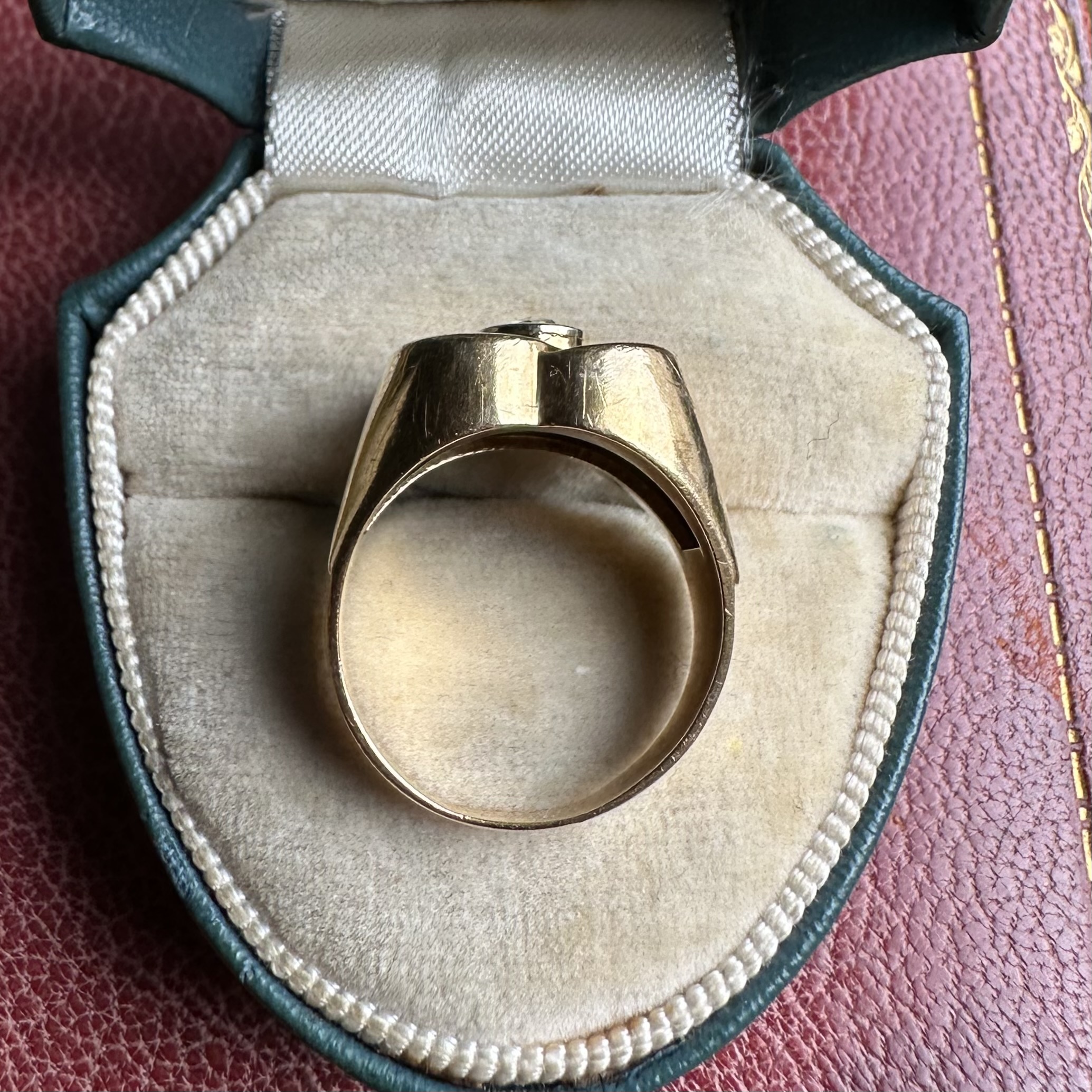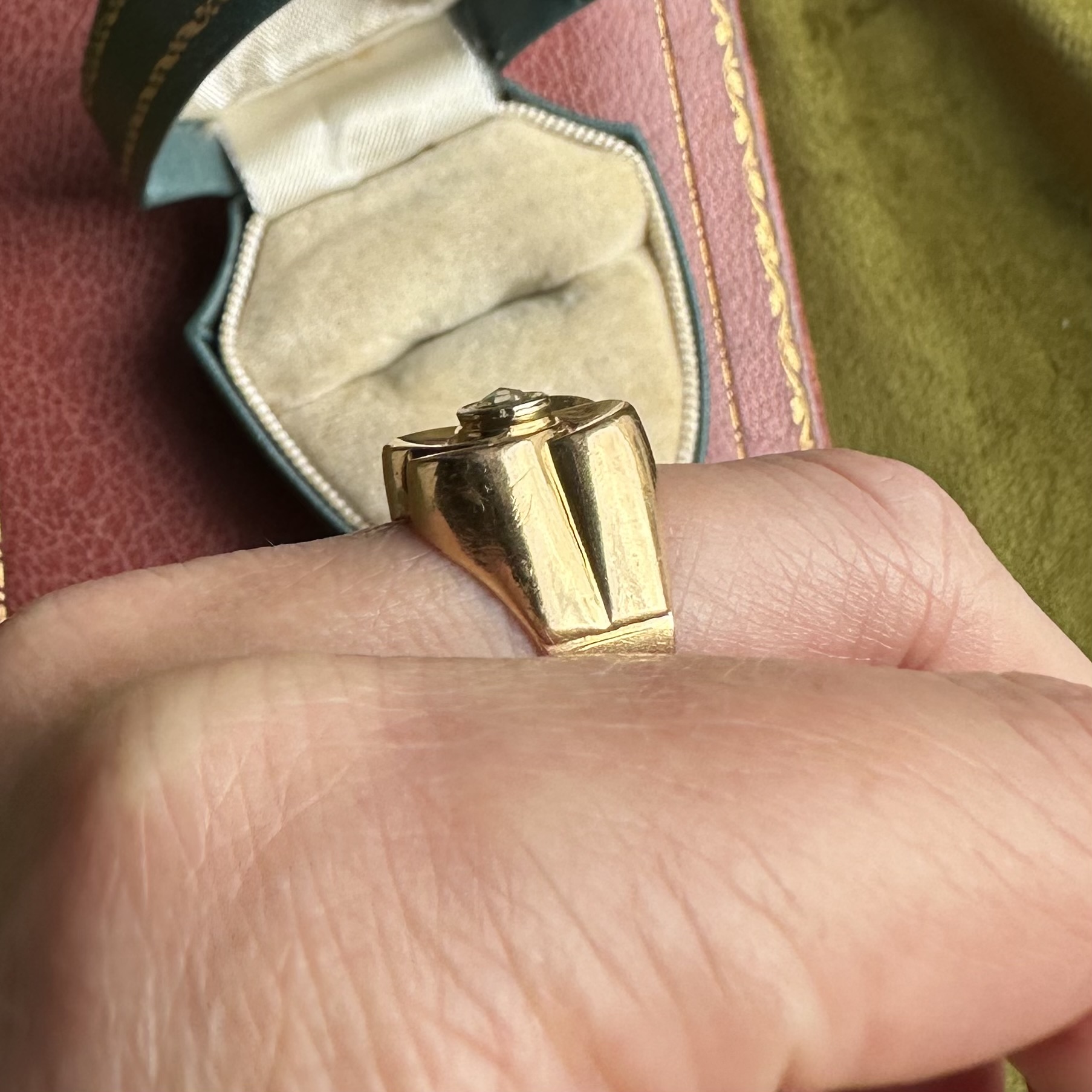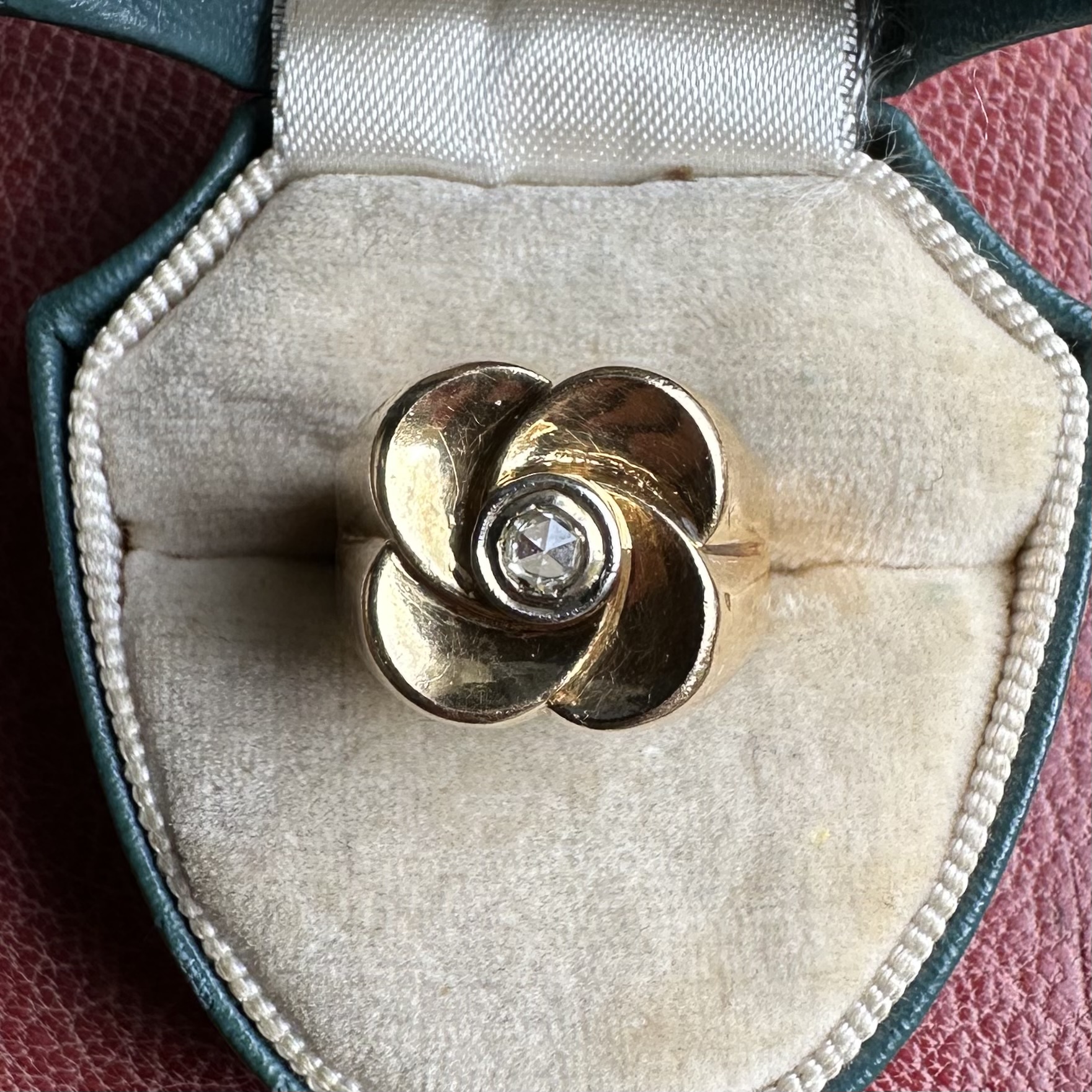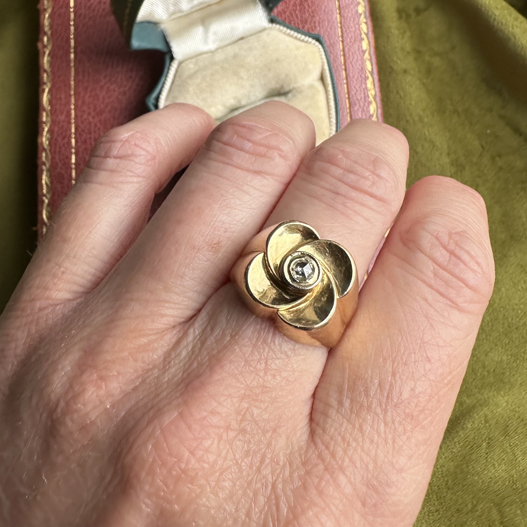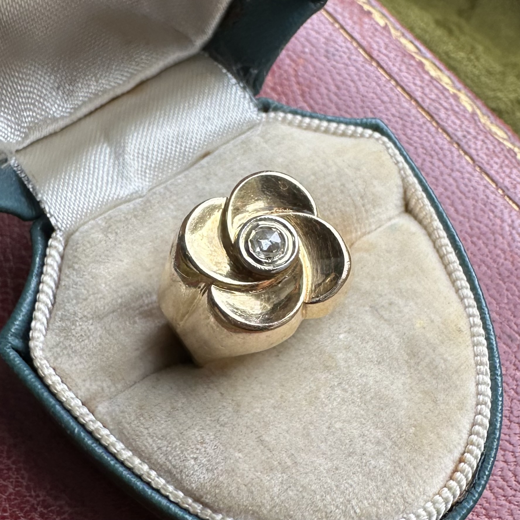 A unique vintage mid-century ring shaped like a quatrefoil blossom with central rose cut diamond