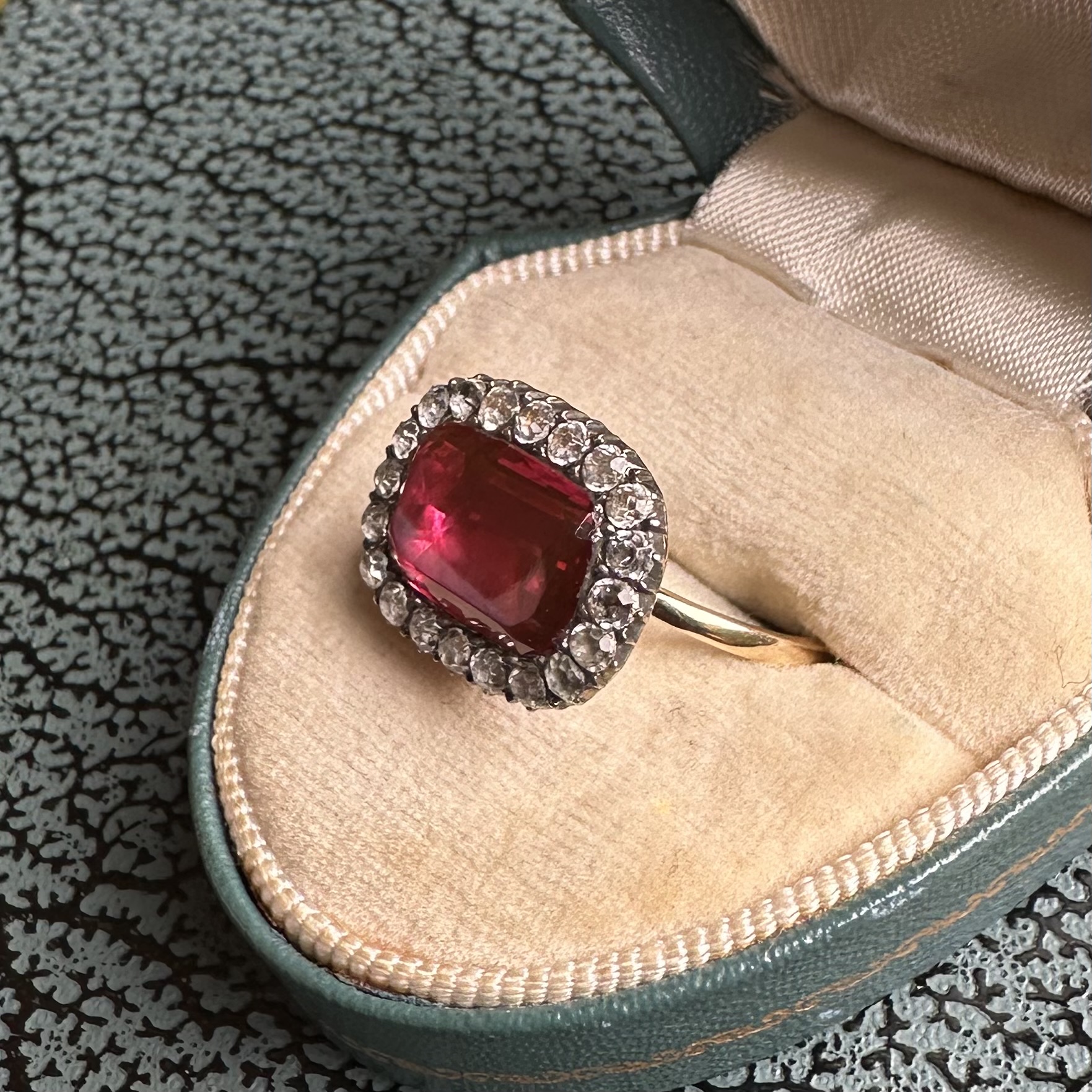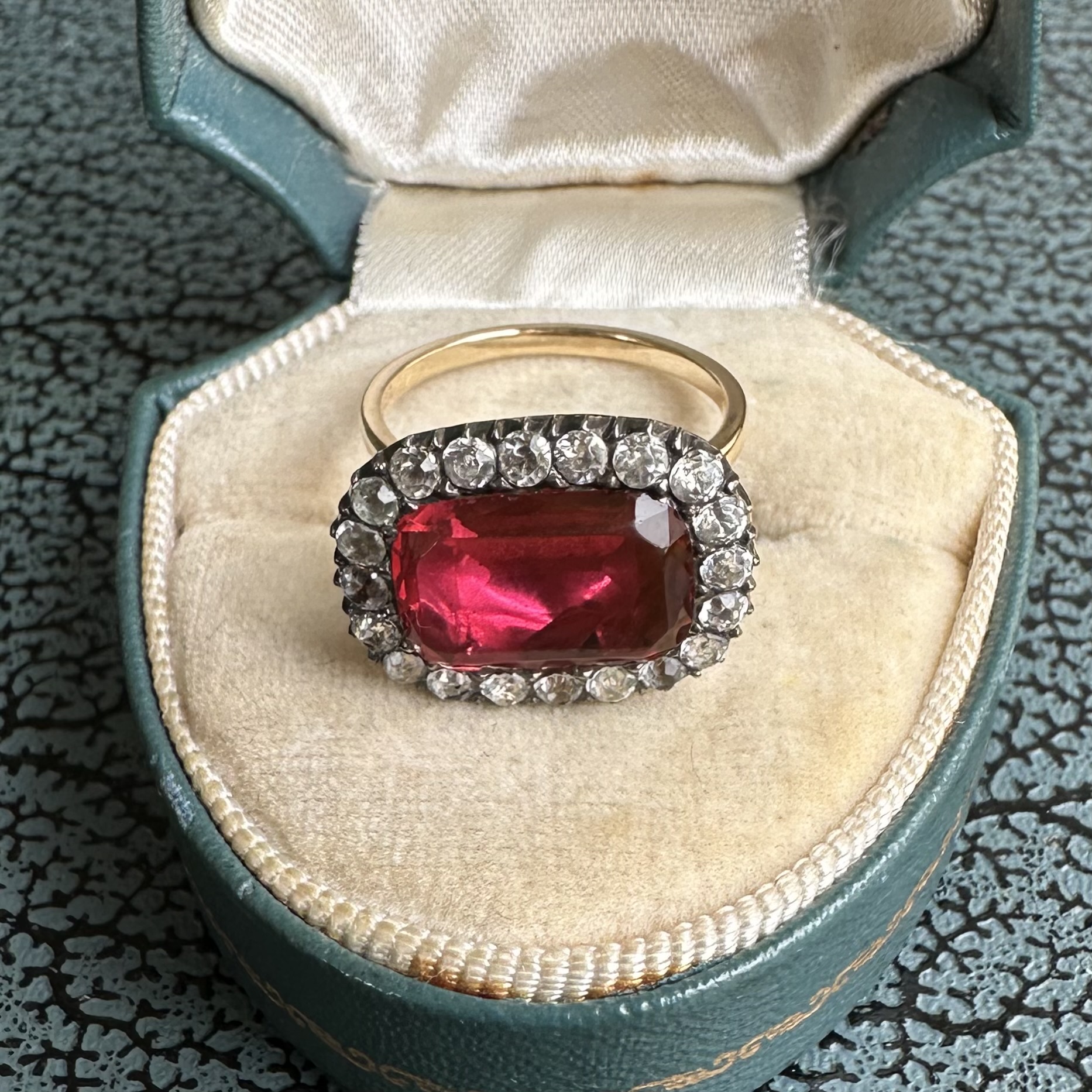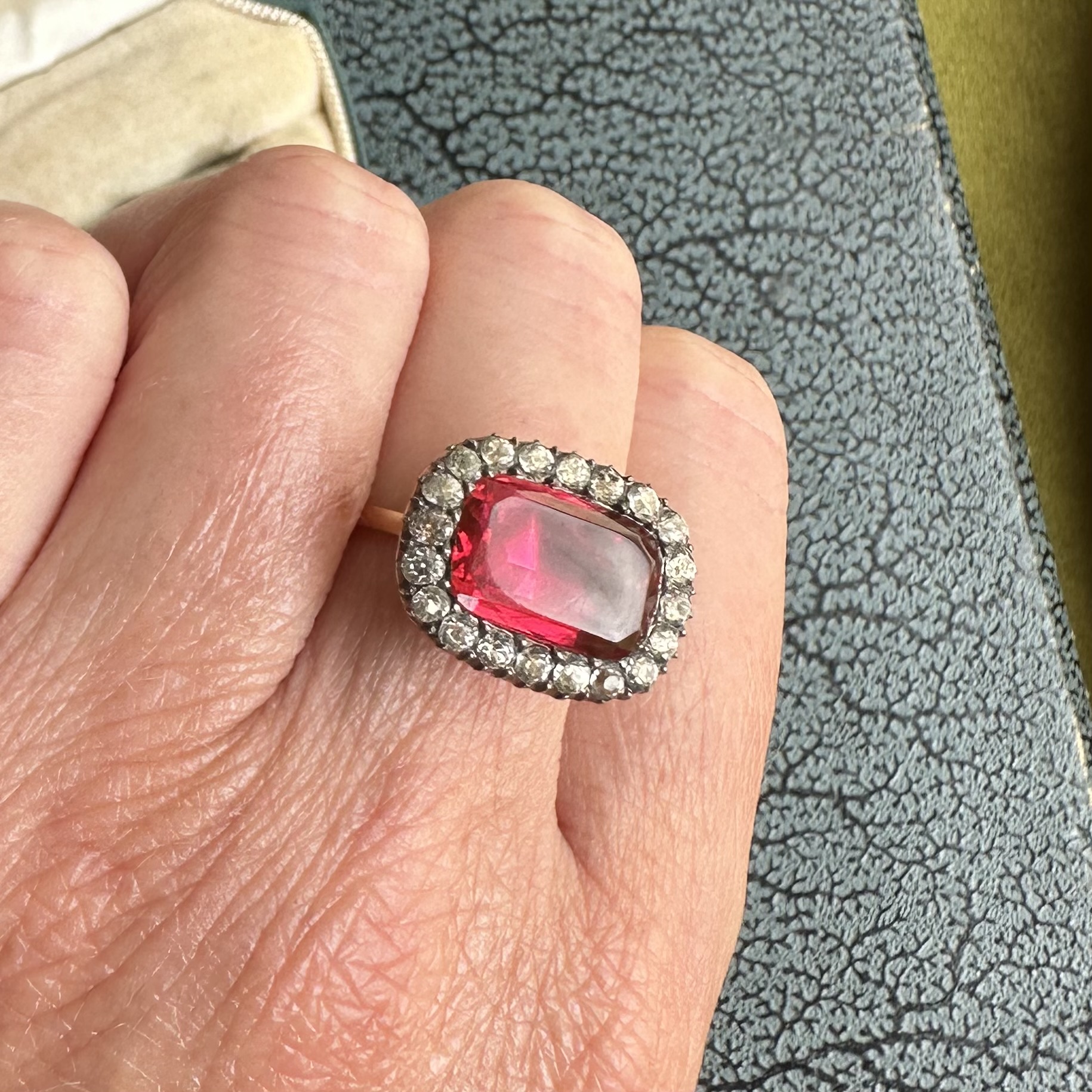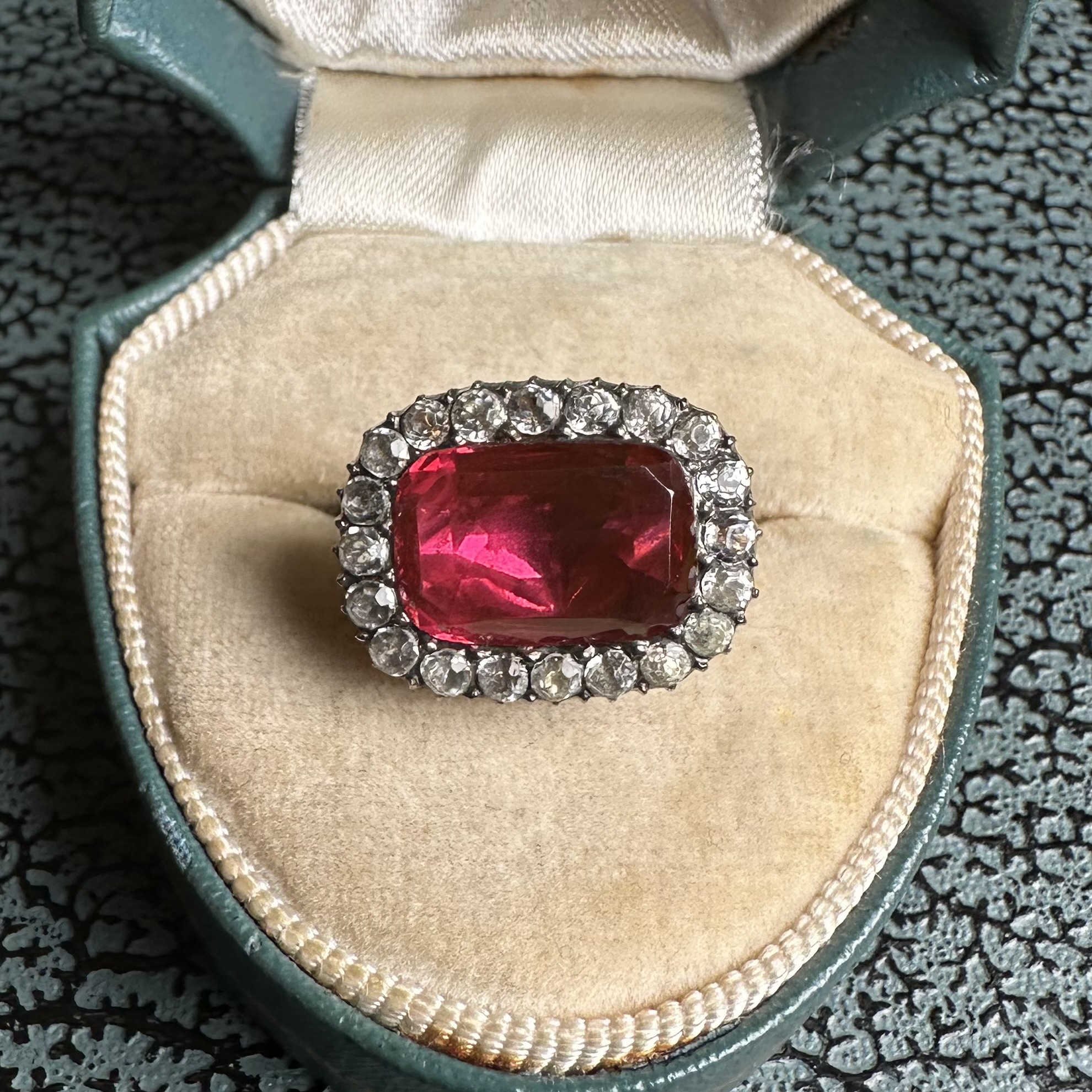 An antique Georgian brooch featuring a vibrant berry pink central stone surround by white old cut pastes in a closed back cut-down collet setting, which has been converted into a ring with the addition of a vintage shank.