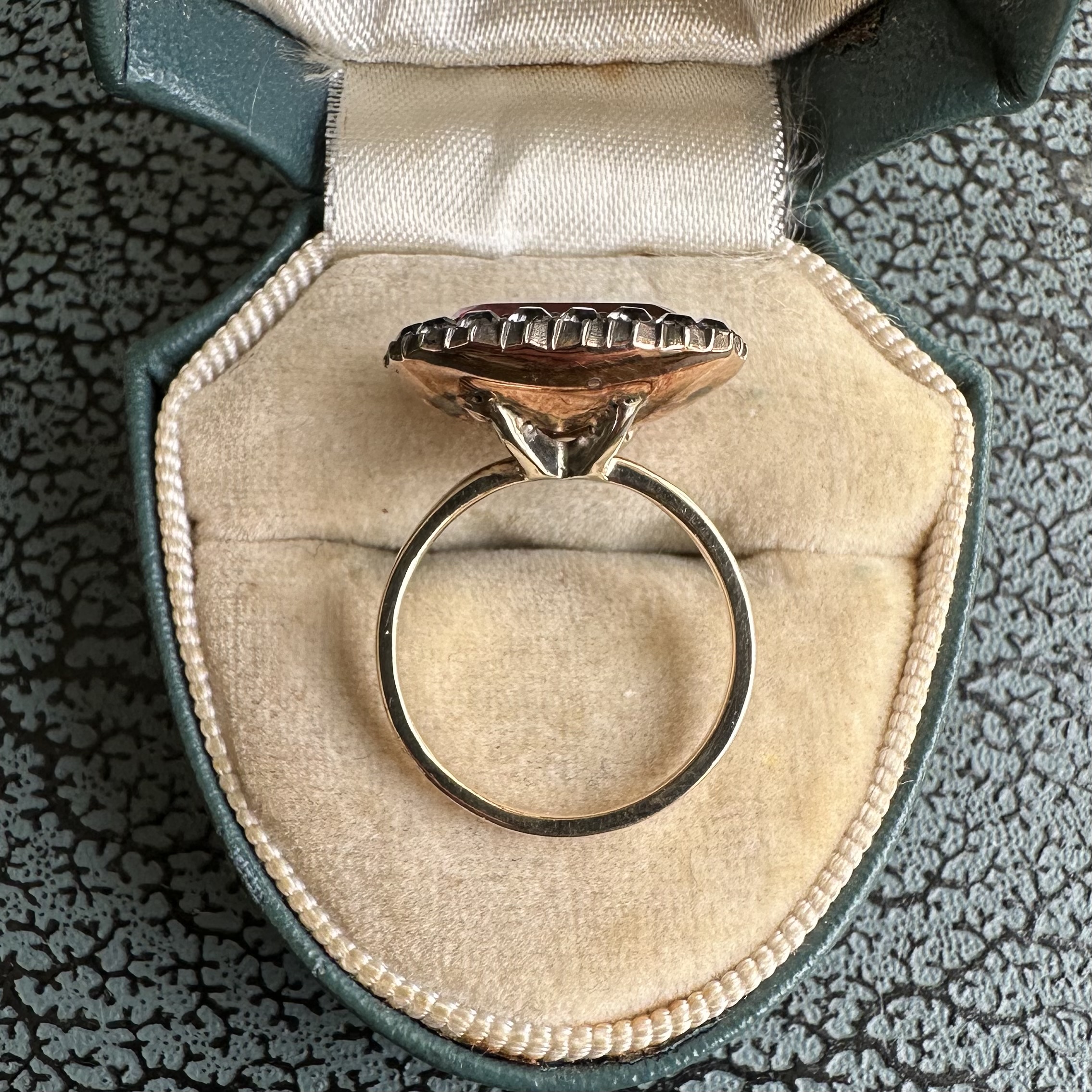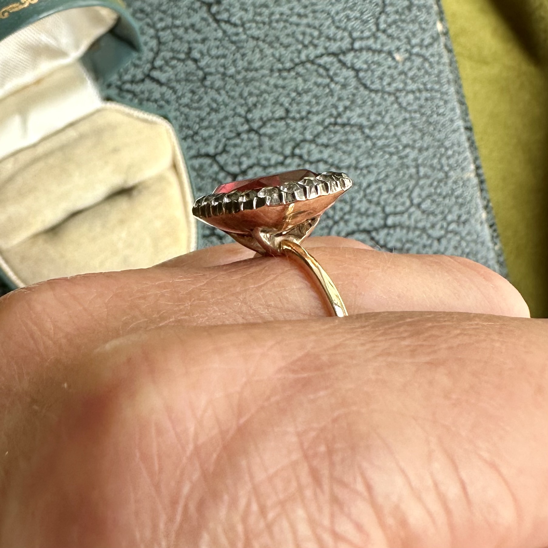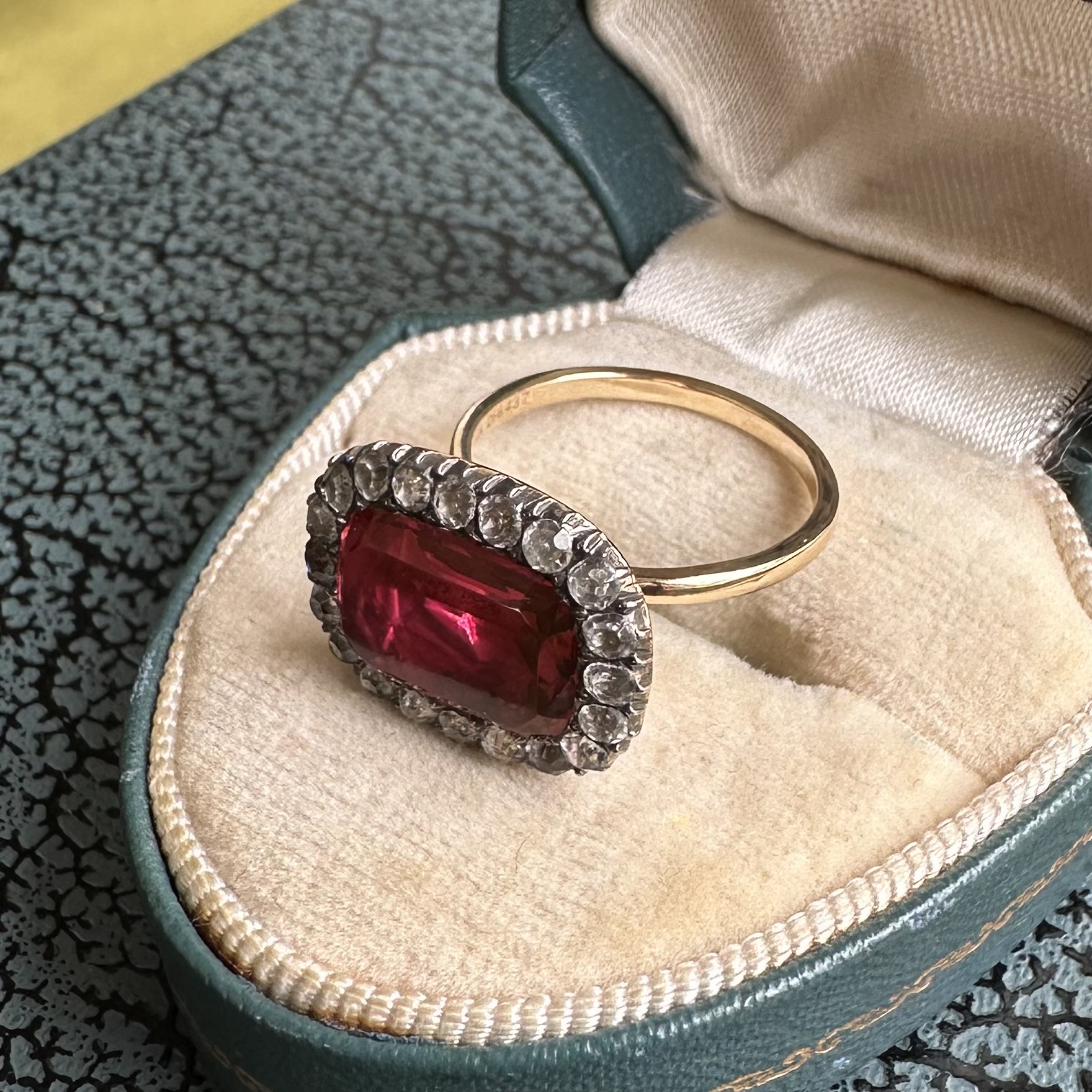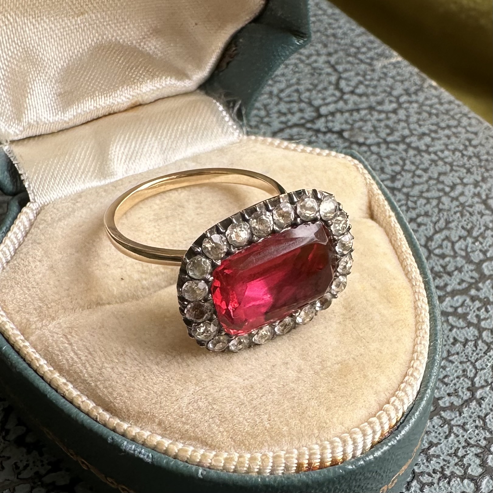 An antique Georgian brooch featuring a vibrant berry pink central stone surround by white old cut pastes in a closed back cut-down collet setting, which has been converted into a ring with the addition of a vintage shank.