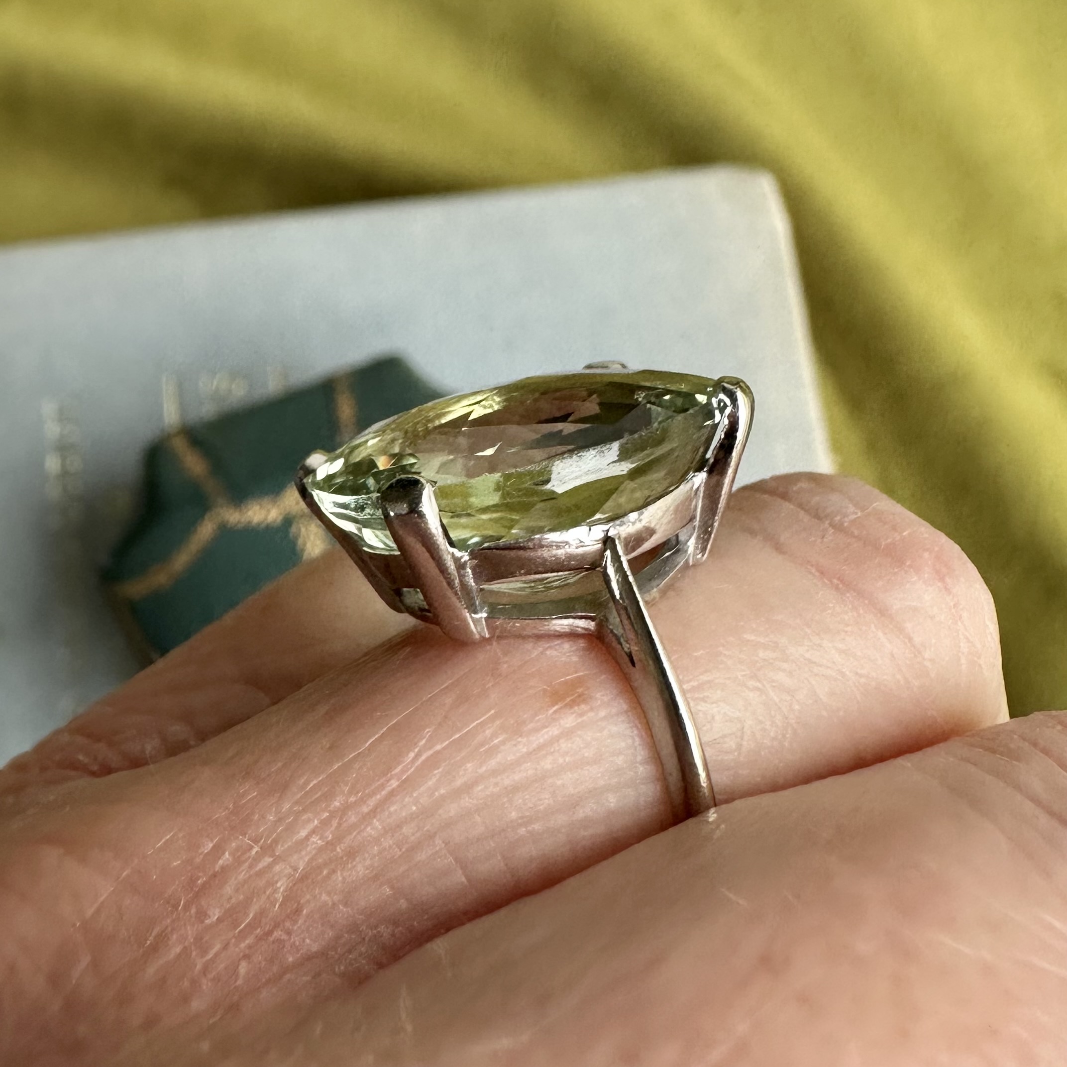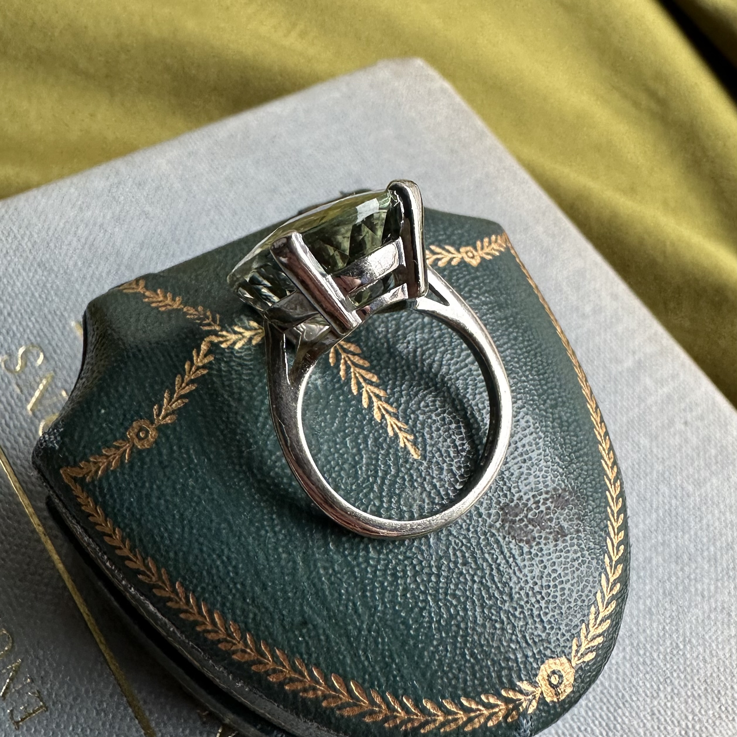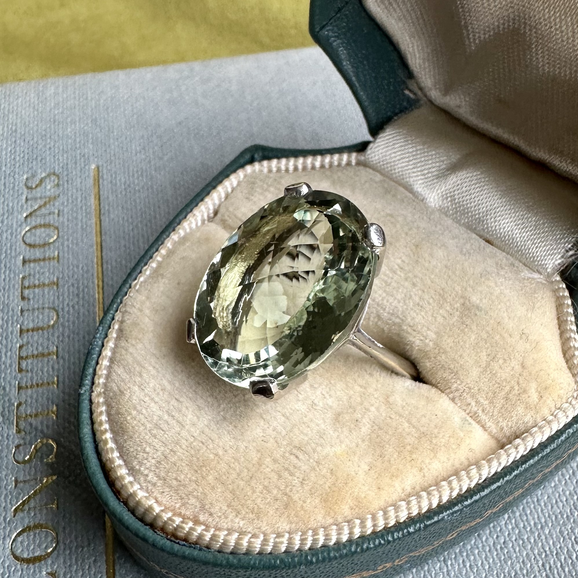 A contemporary large oval chequerboard cut mint green amethyst cocktail ring.