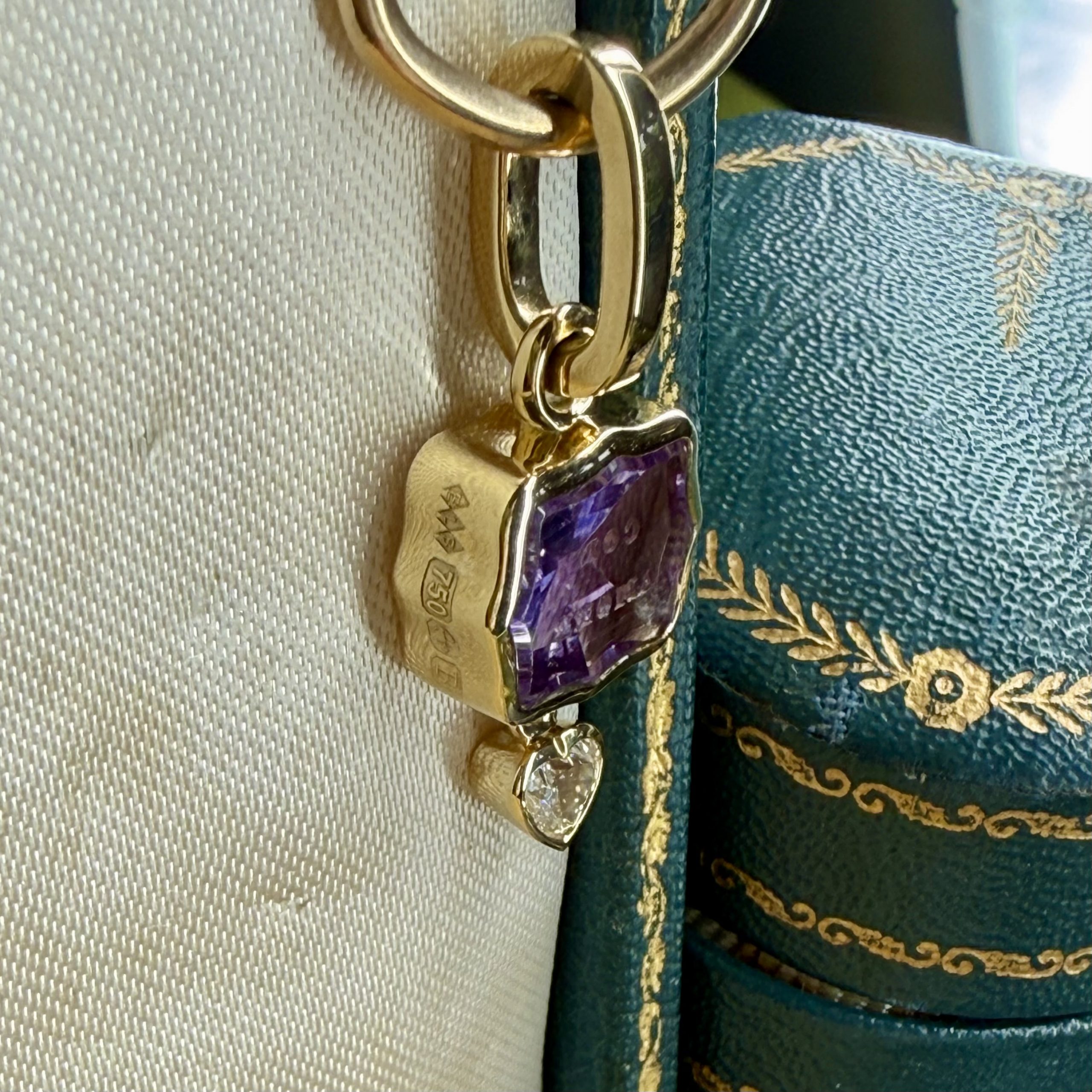 | Jewellery material | GIA certified natural modern brilliant white diamond, Heart diamond is 030ct, Colour F, Clarity VS2, Modern brilliant cut, The GIA diamond certification will ship with the pendant for your records, 18ct yellow gold, Amethyst |