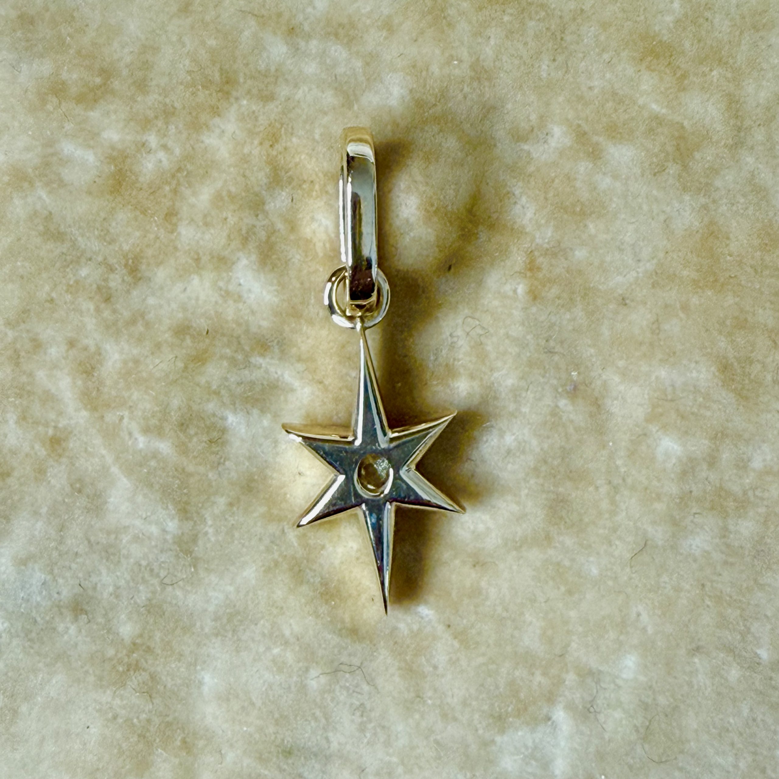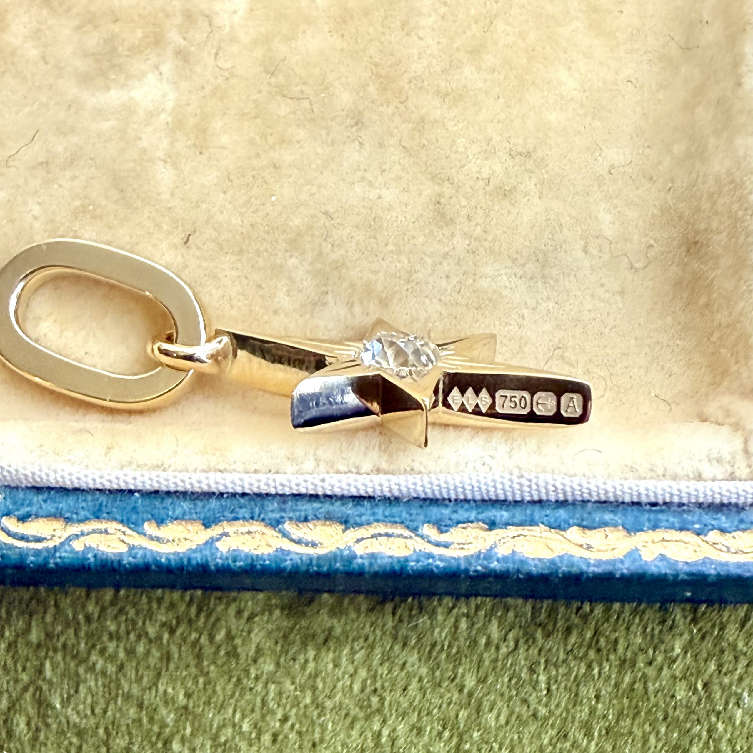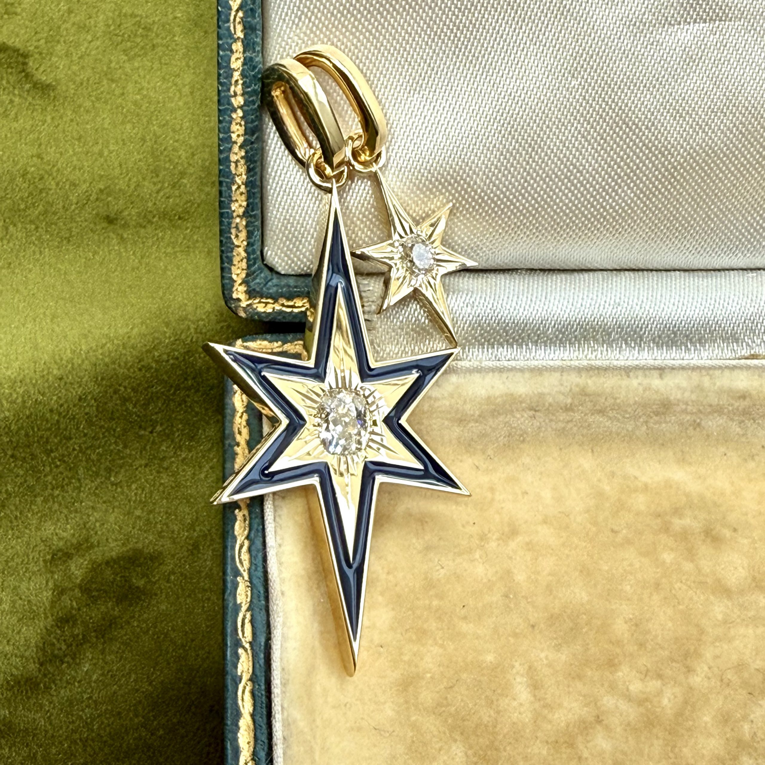 A beautiful old cut diamond of 0.76ct that we have set as a North Star in 18ct yellow gold with midnight blue enamel work and engraved starburst detail.