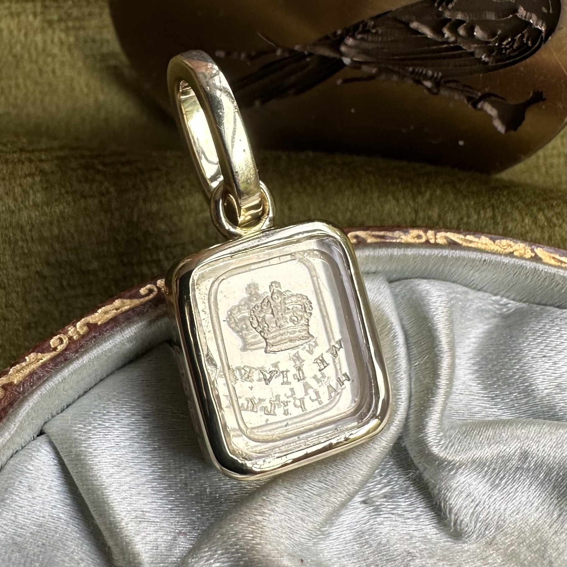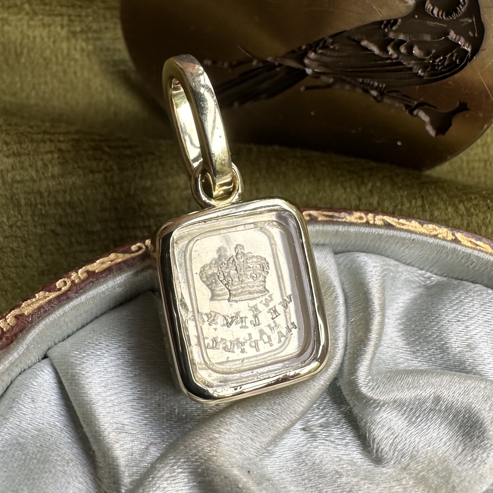 An antique paste mimicking rock crystal featuring imagery of a crown and text ‘We live happily’
