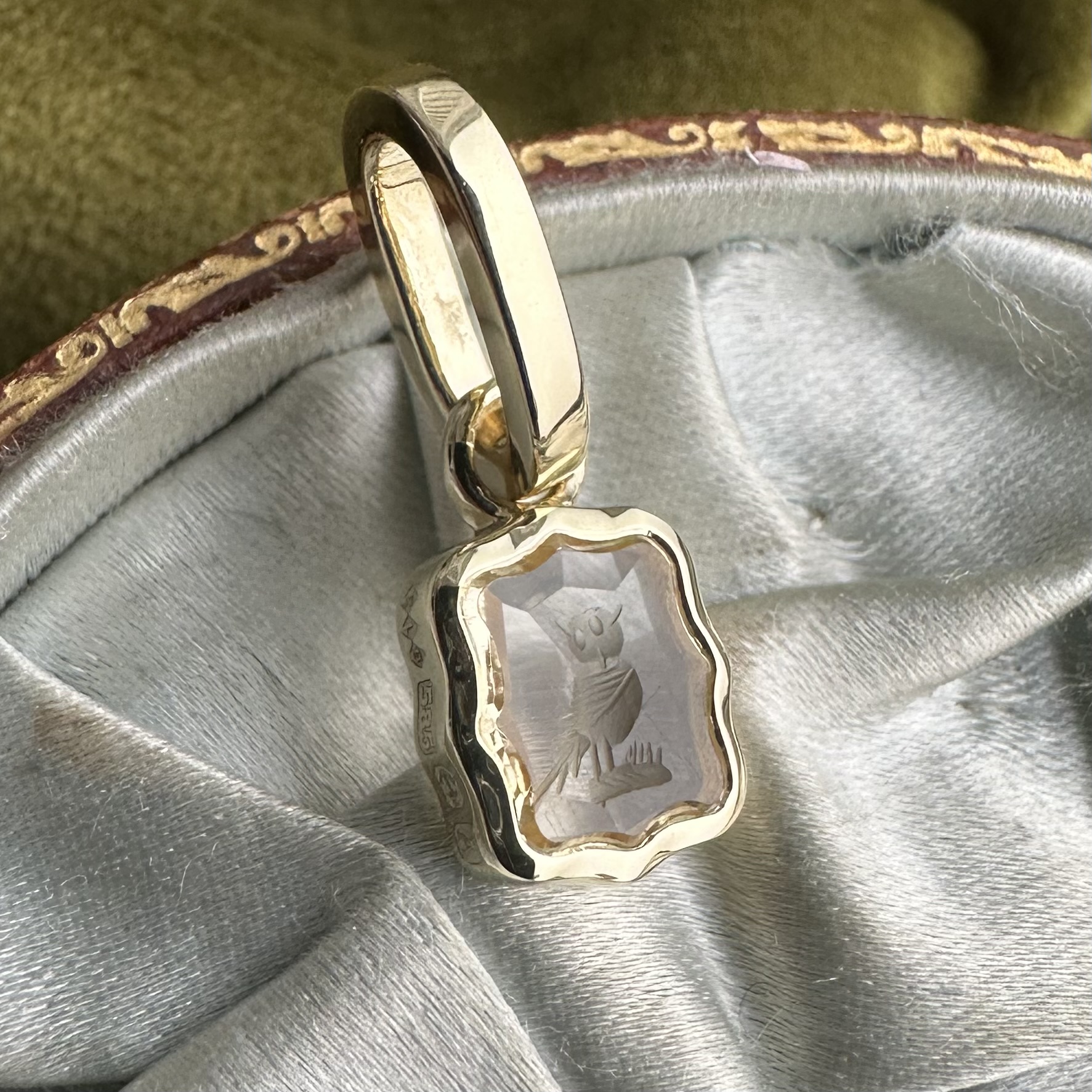 An antique pale yellow citrine with facet back detail featuring imagery of a charming owl symbolising wisdom, knowledge and intuition.