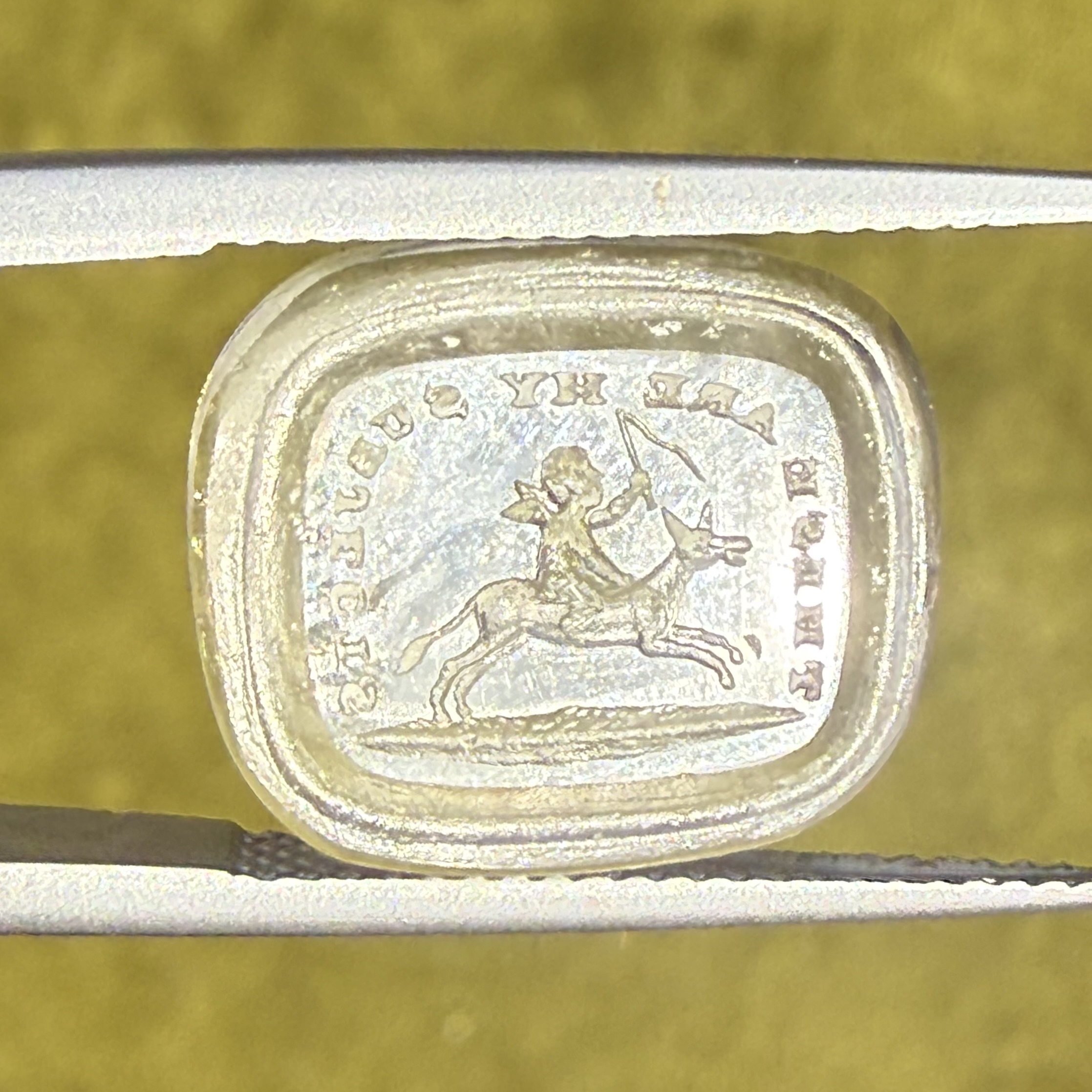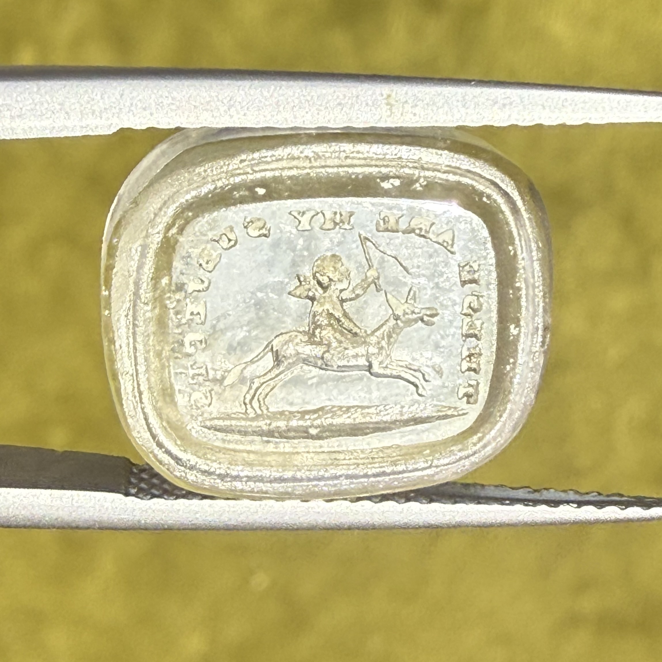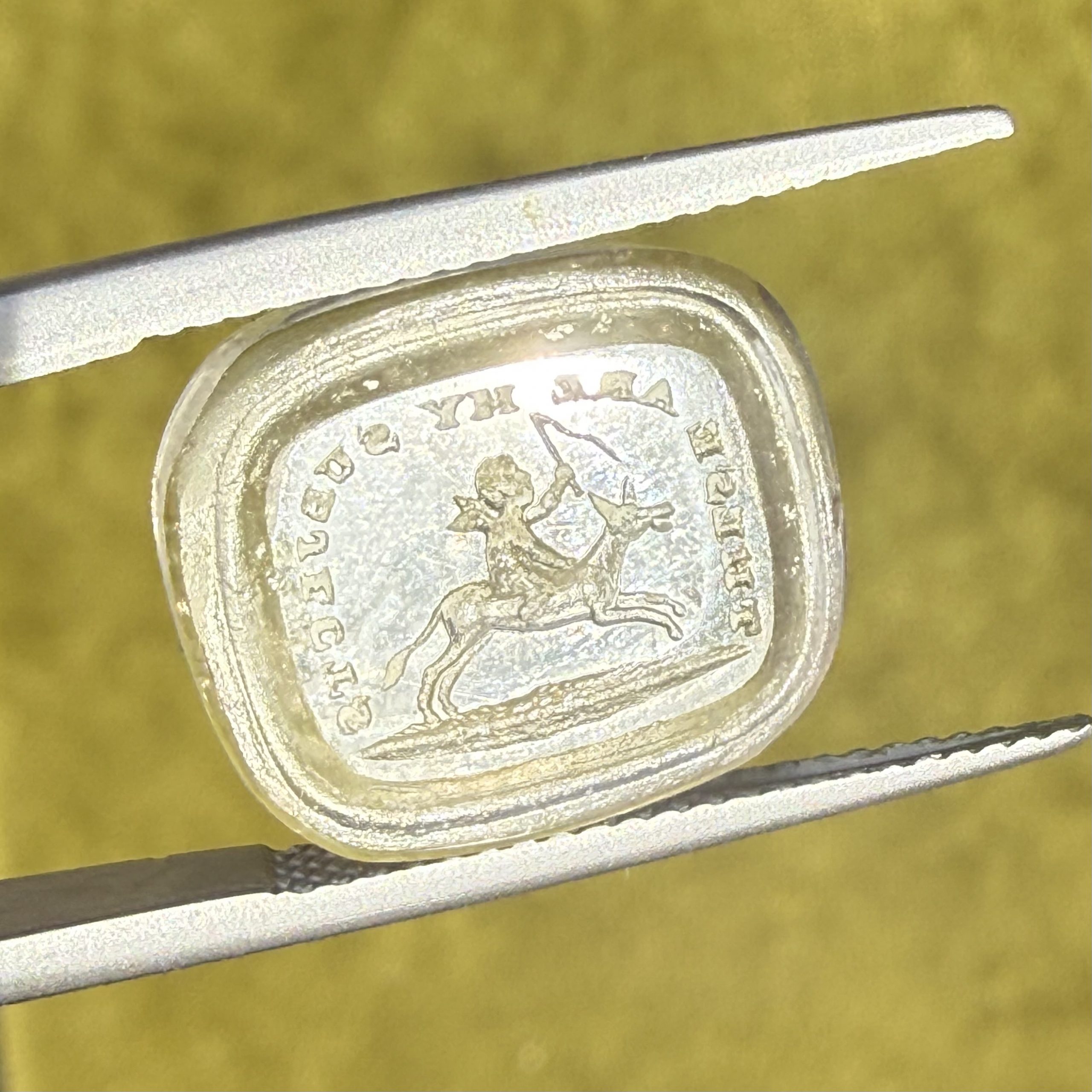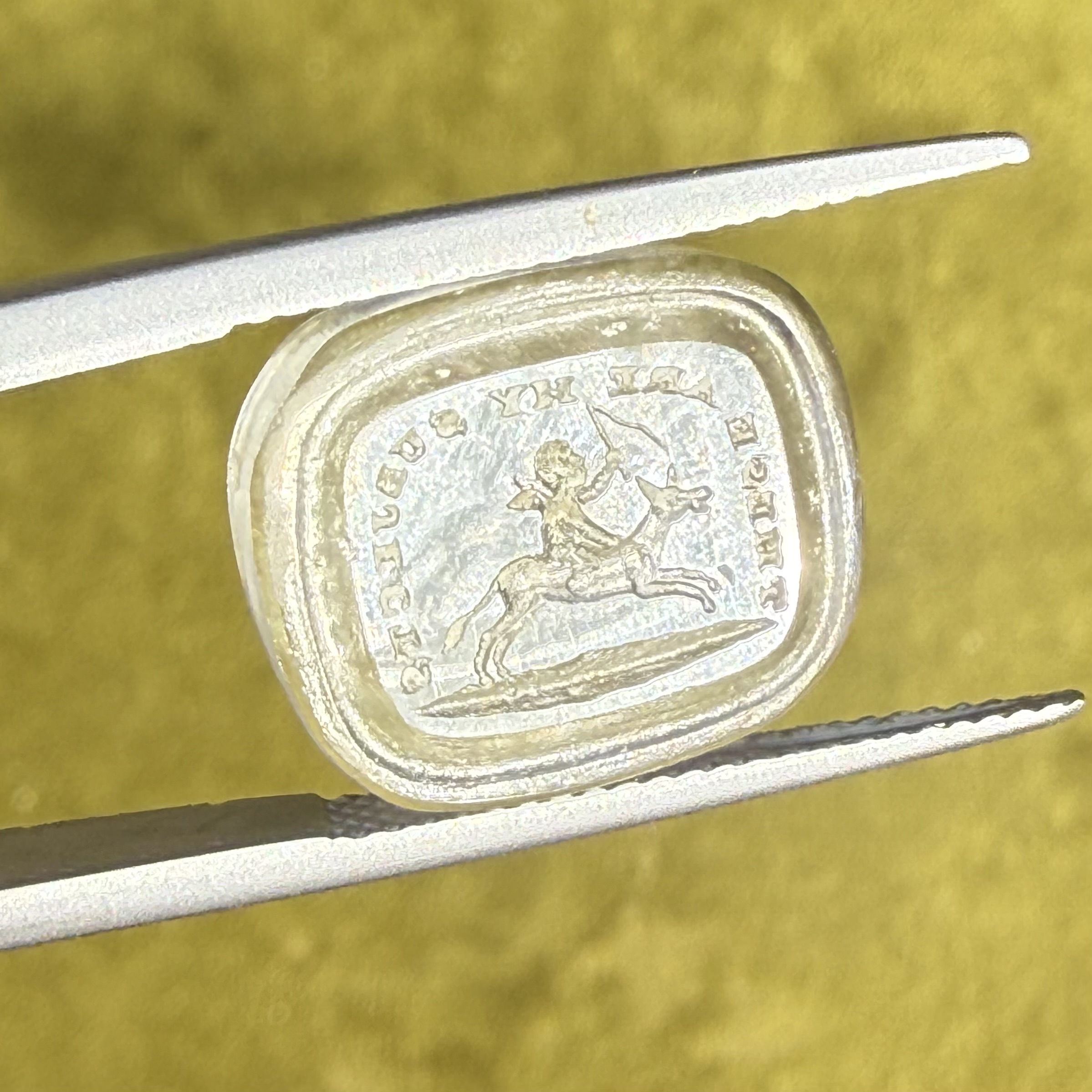 An Antique clear paste seal to mimic rock crystal depicting Cupid riding an out of control, galloping donkey (do donkeys gallop?!) accompanied by the overarching motto ‘These Are My Subjects’