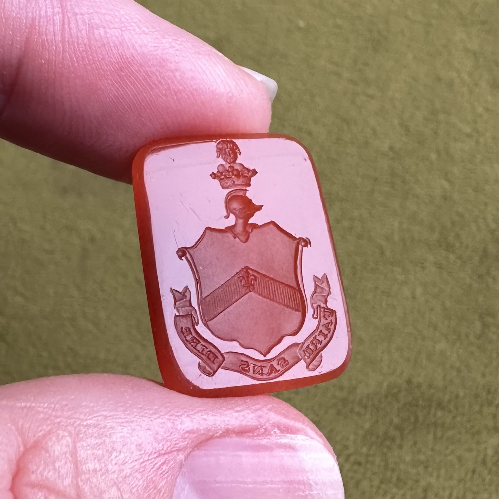 An antique carnelian intaglio featuring imagery of a shield with fleur de lis, knights helmet, and crest of a crown with bearded man.