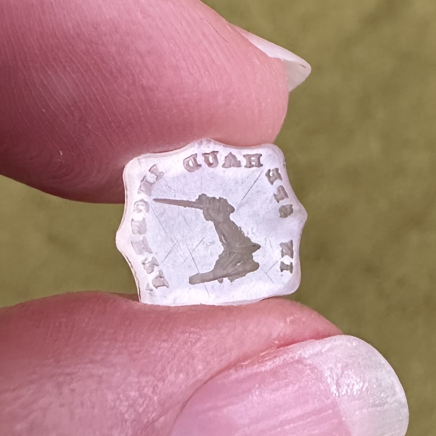 A beautifully carved white chalcedony intaglio featuring imagery of a forearm holding a sword aloft poised to strike!