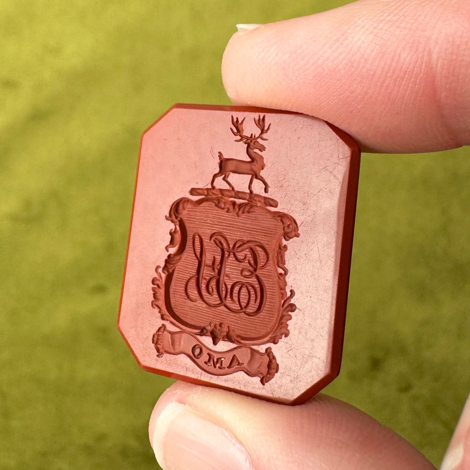 A sizeable terracotta coloured hard stone featuring incredibly detailed imagery of a prancing stag on top of a crest containing initials, possibly EJS.