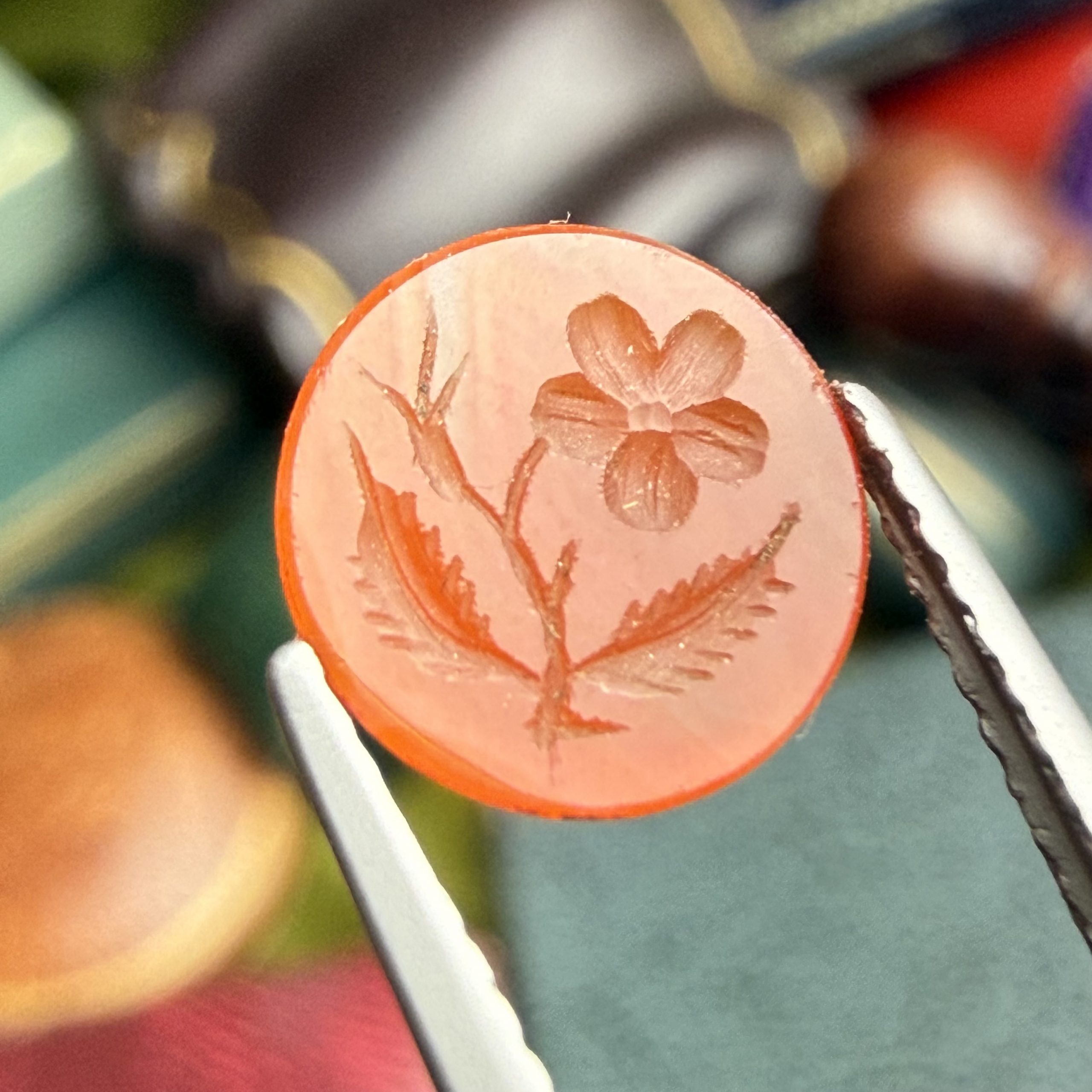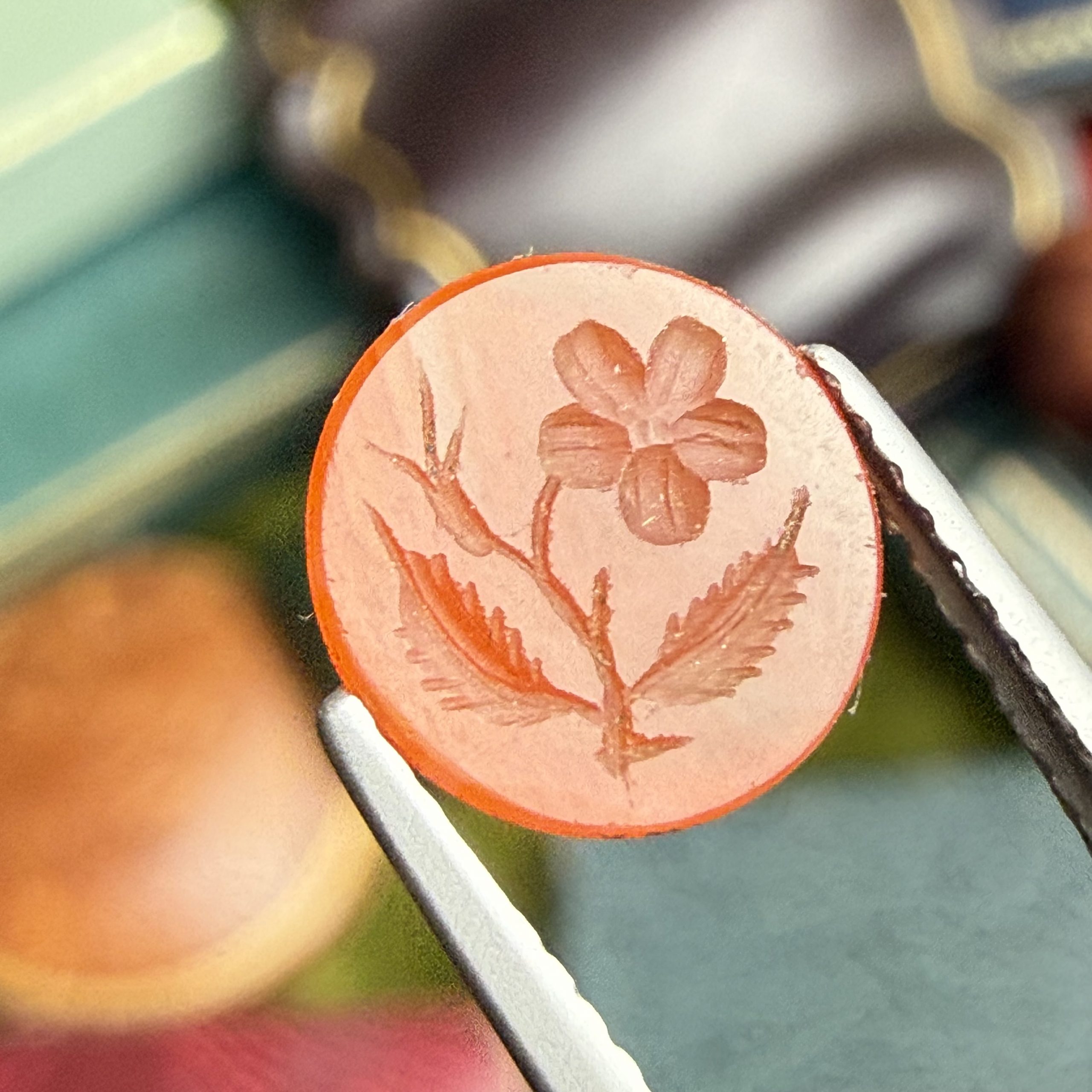 An early Victorian striated orange agate intaglio depicting a pansy flower