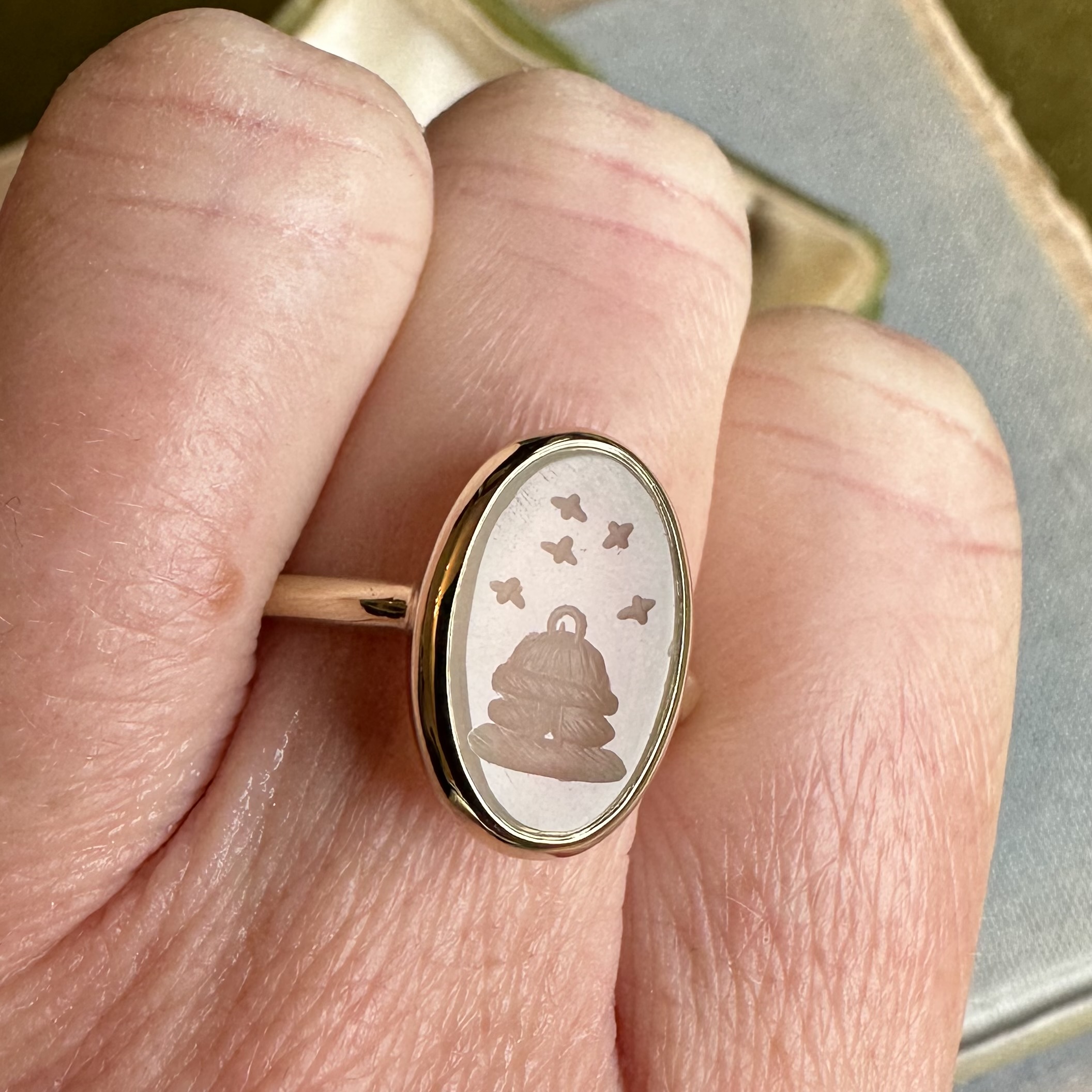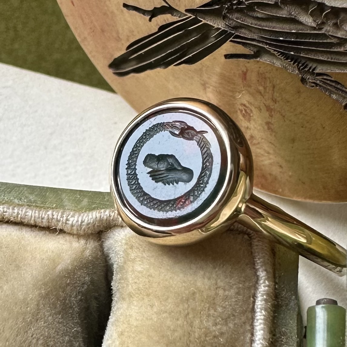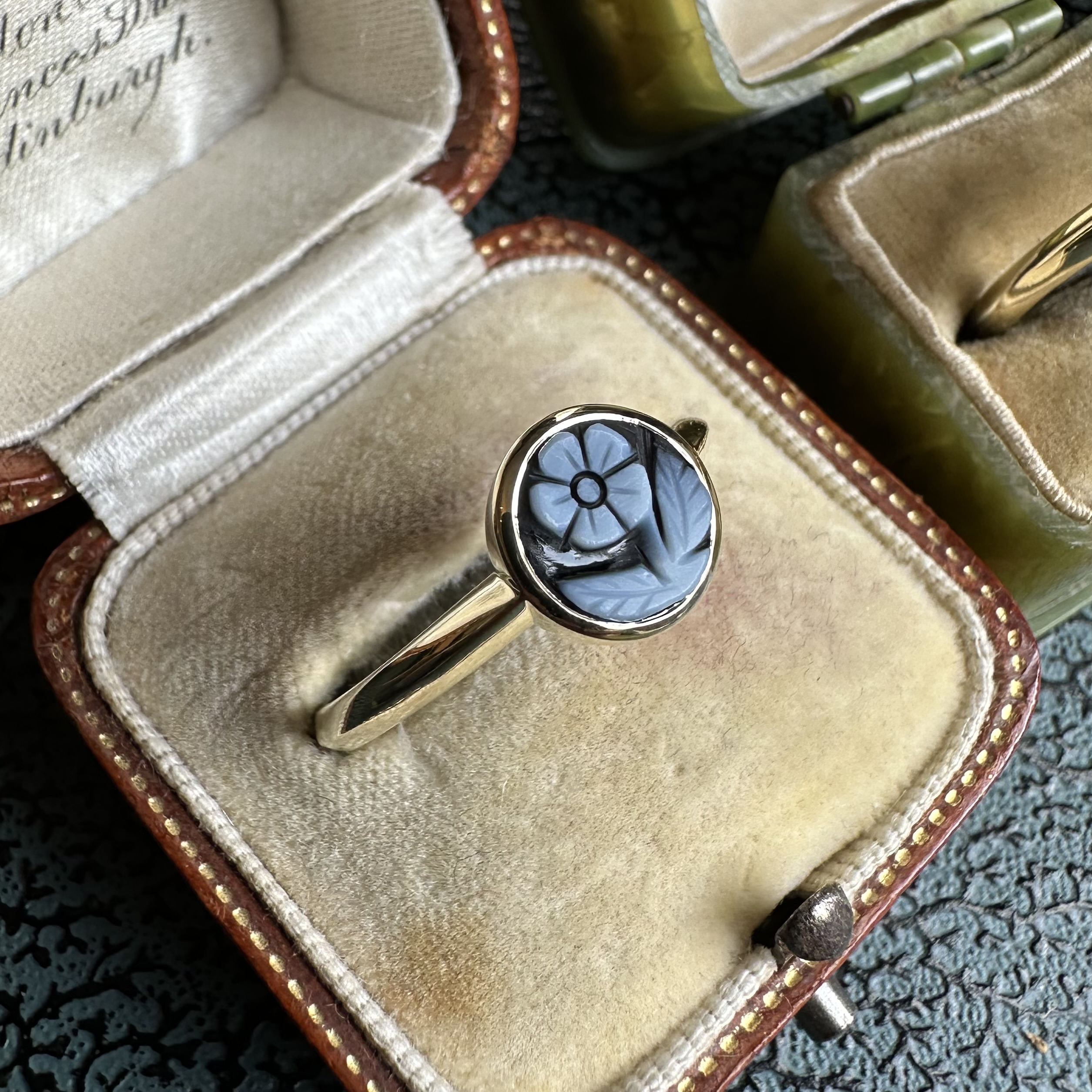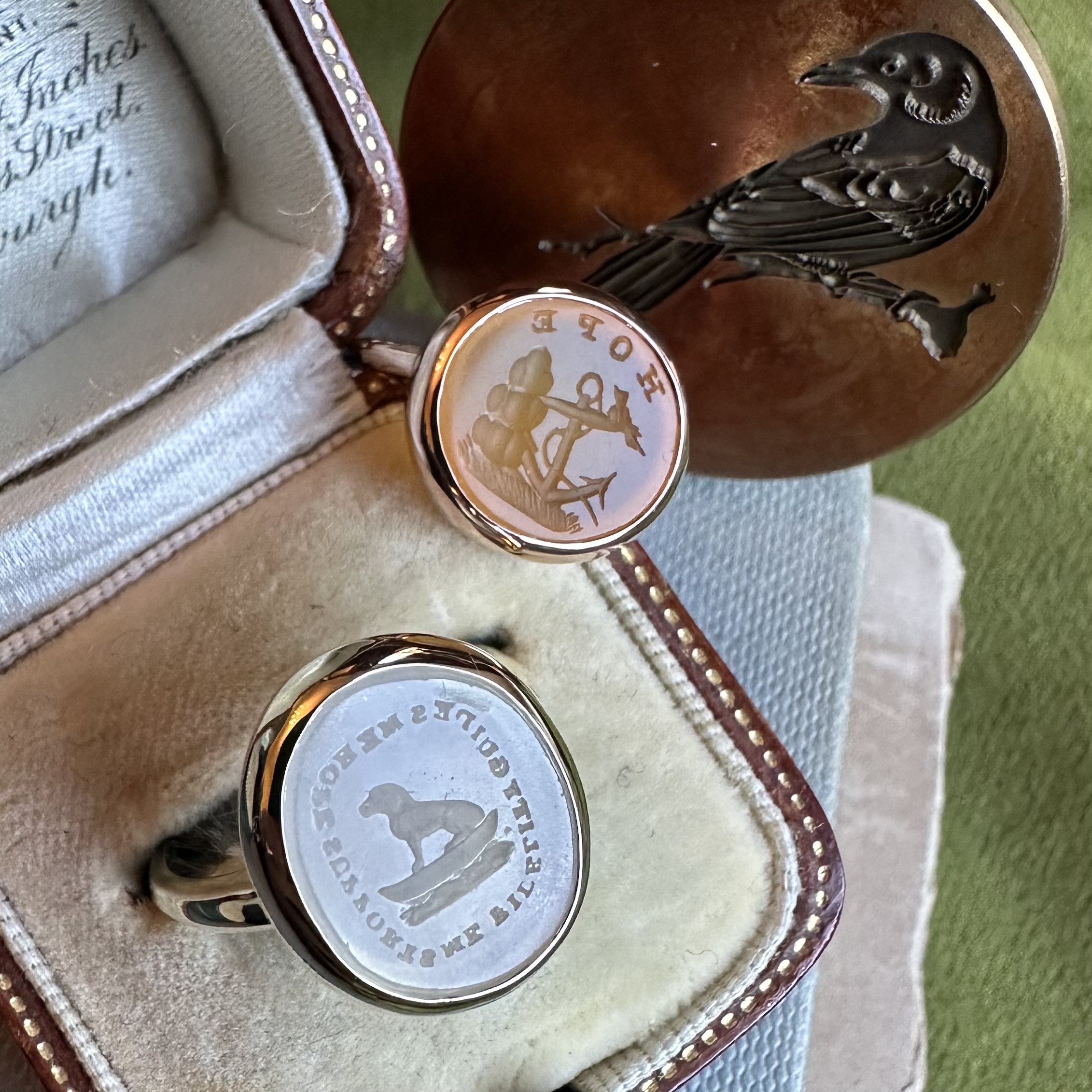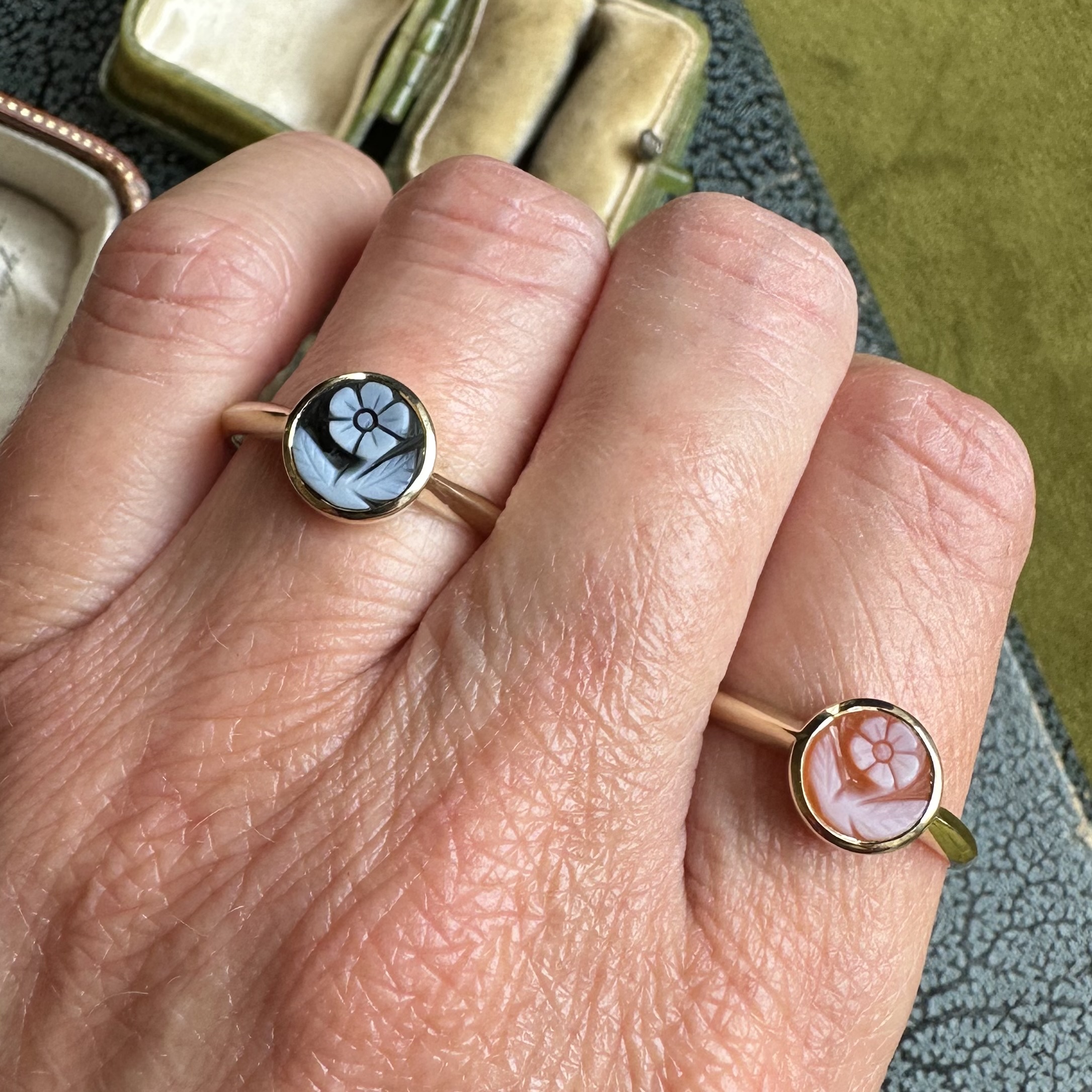 It is important to note that the term dainty was originally coined with reference to the minimalist gold bezel of gold and not to the size of finished piece itself. So dainty setting would have been a much better moniker because it is perfectly possible to have a dainty ring featuring a whacking great intaglio that is quite the finger covering statement piece. Emma didn’t think that through when she named them did she?!