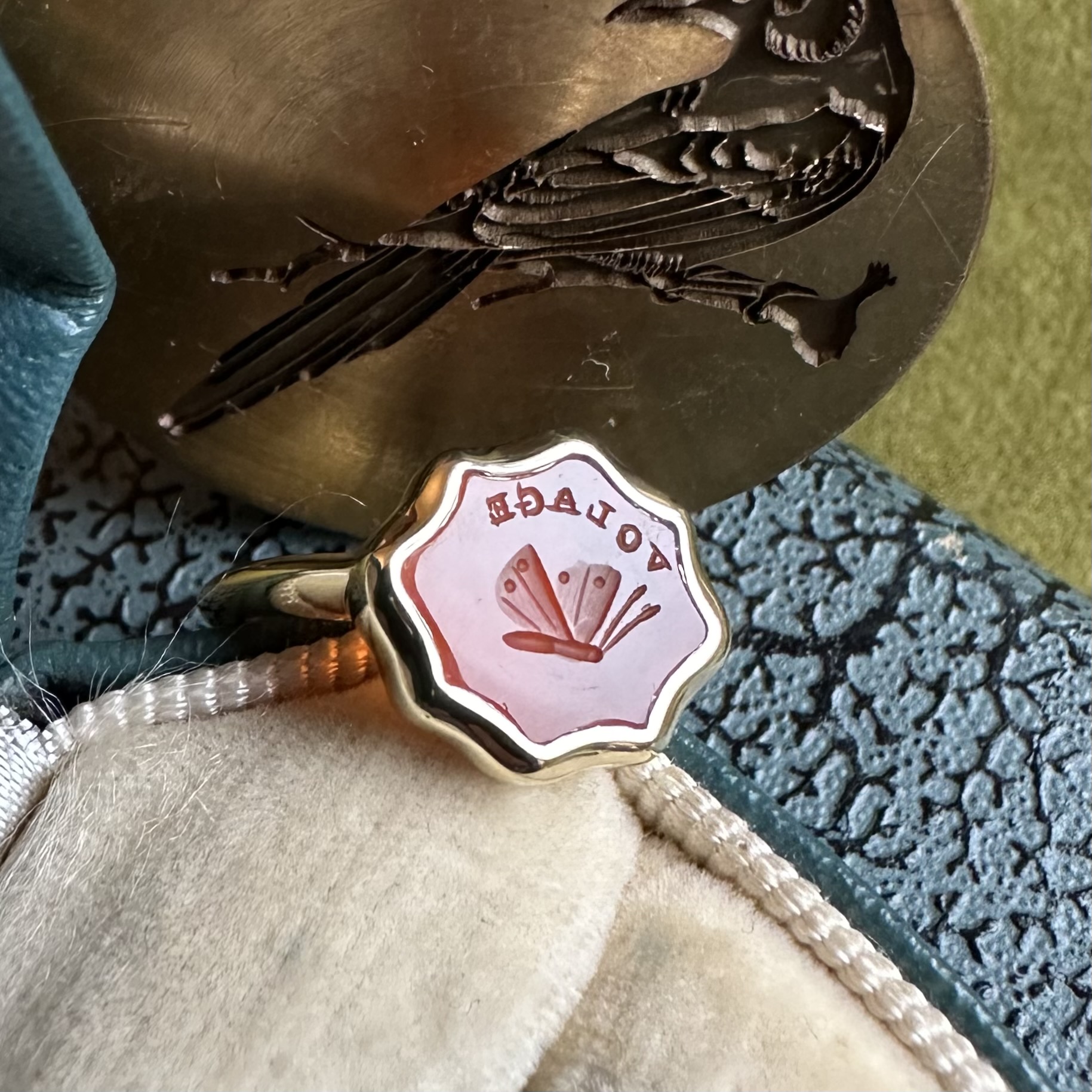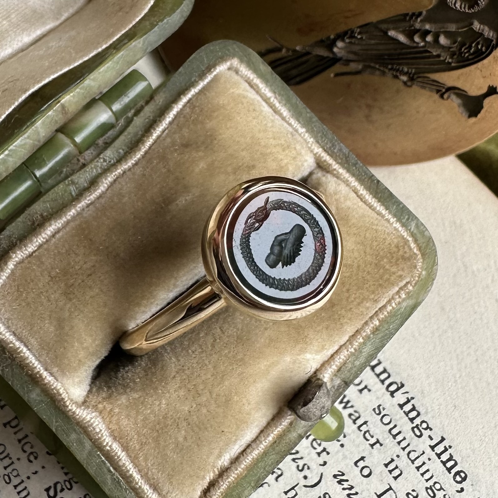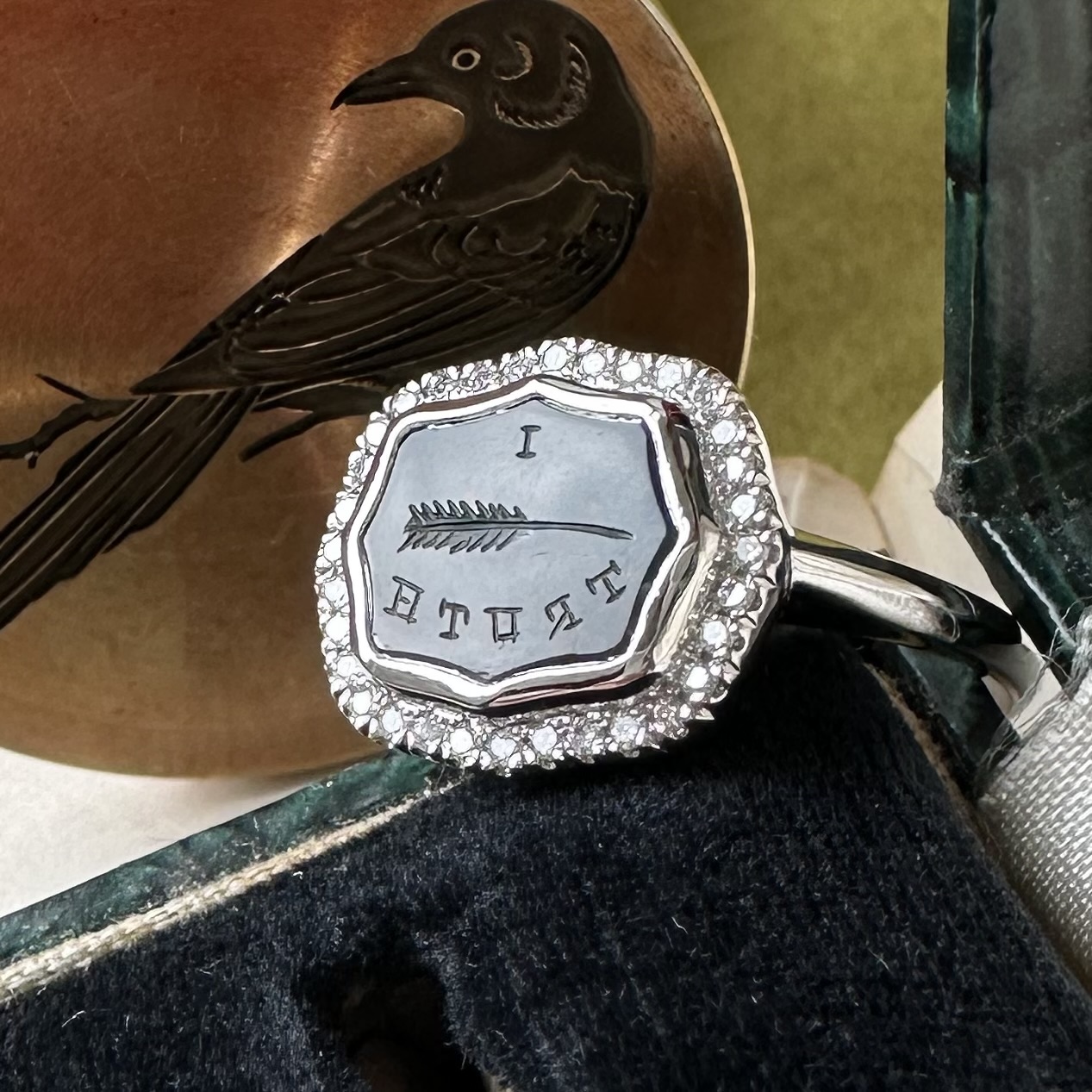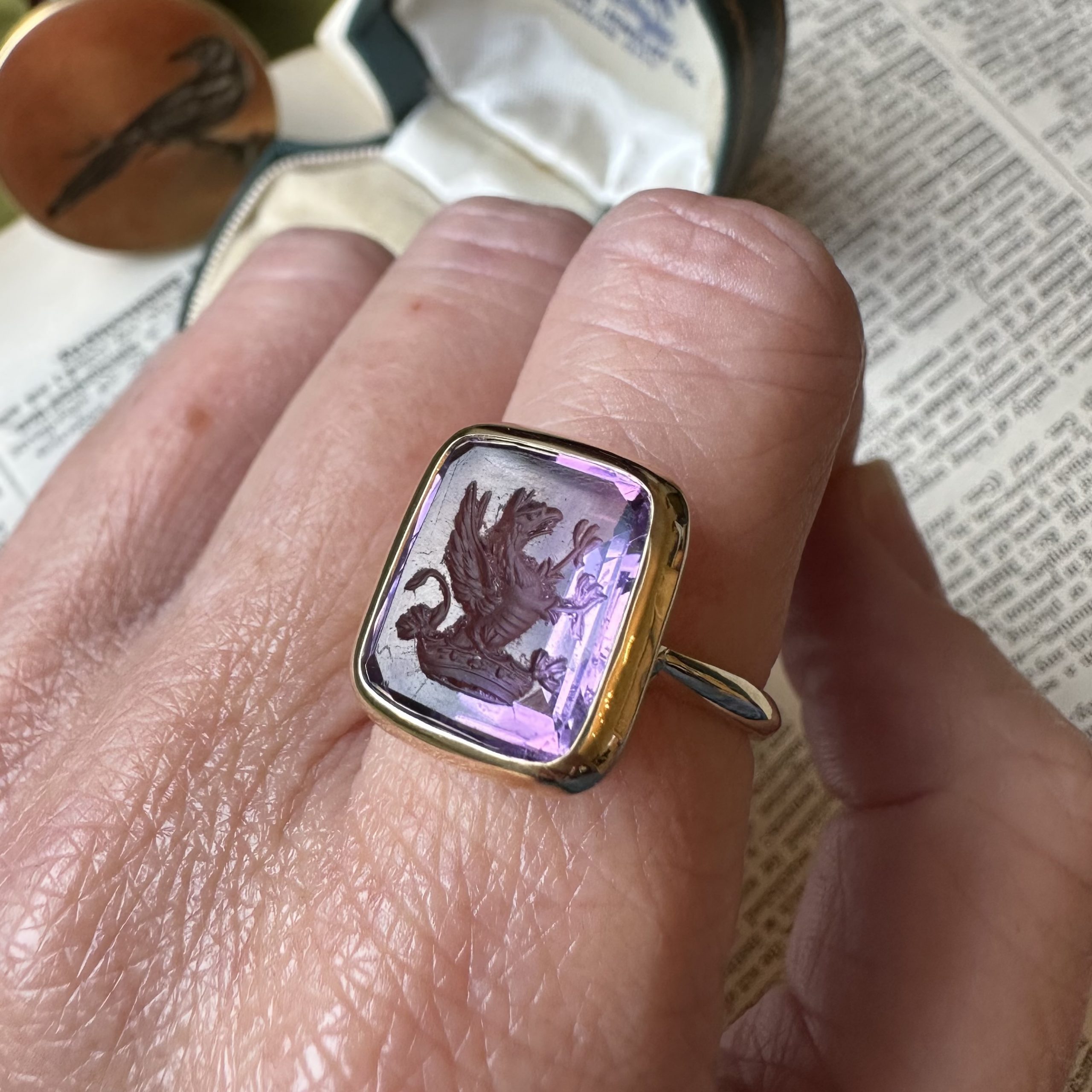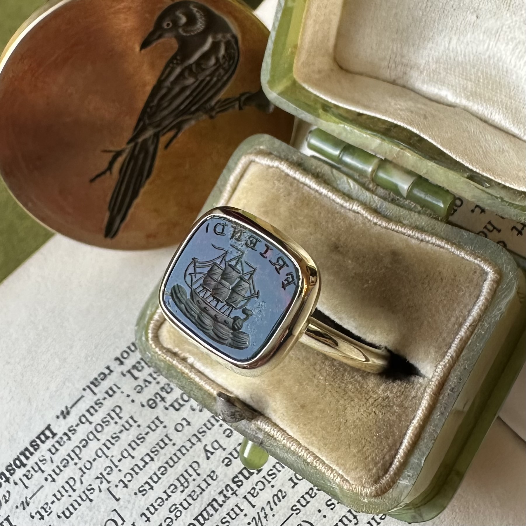 It is important to note that the term dainty was originally coined with reference to the minimalist gold bezel of gold and not to the size of finished piece itself. So dainty setting would have been a much better moniker because it is perfectly possible to have a dainty ring featuring a whacking great intaglio that is quite the finger covering statement piece. Emma didn’t think that through when she named them did she?!