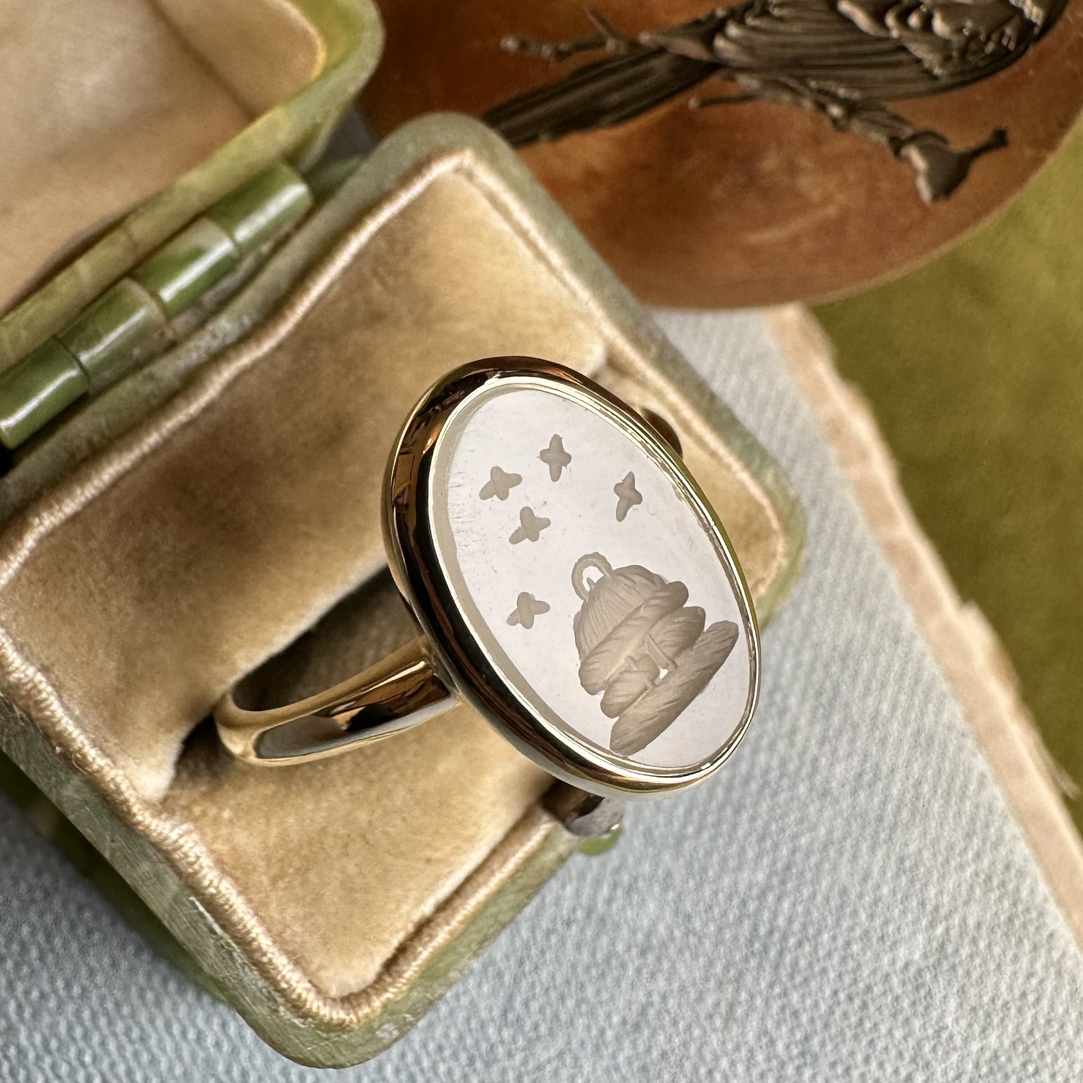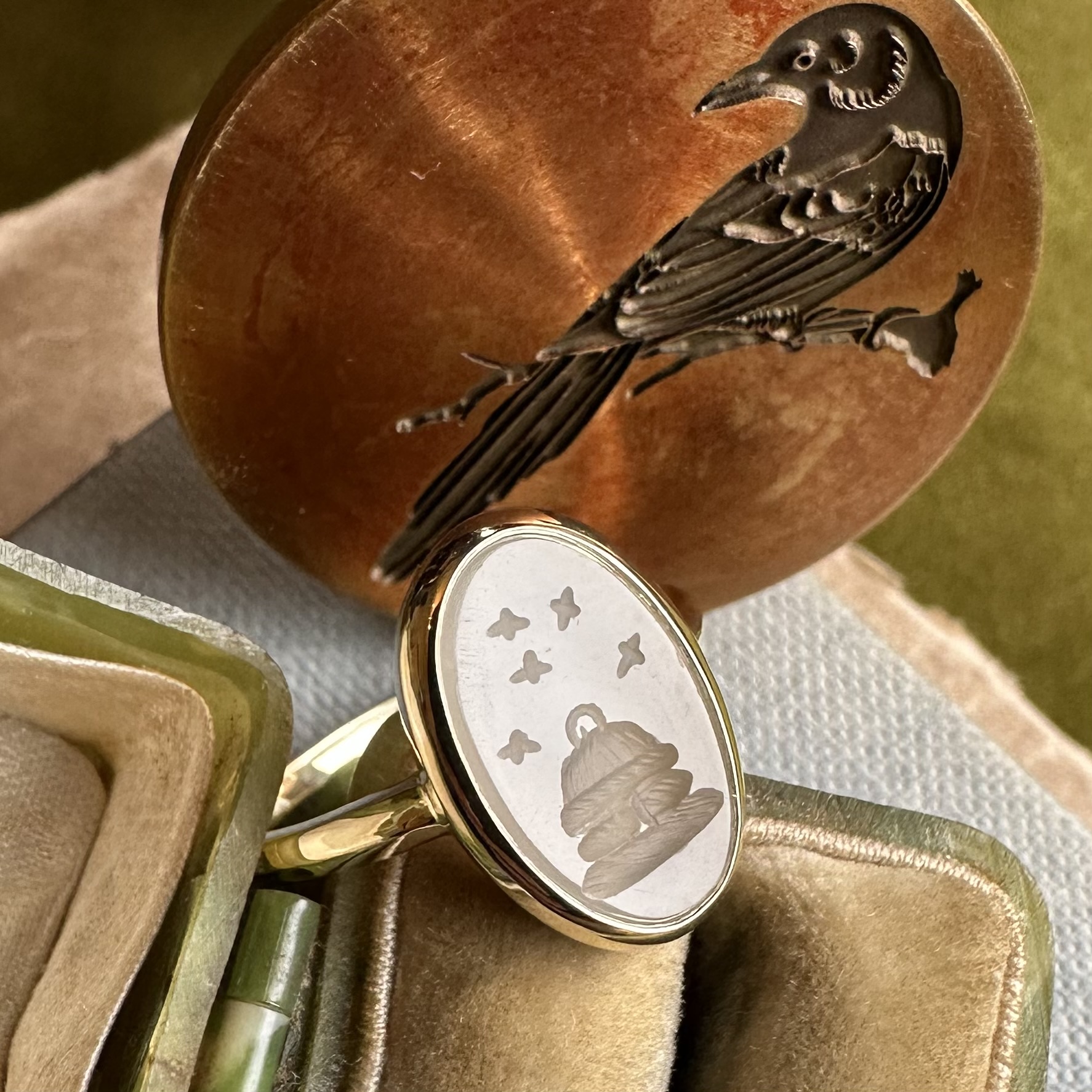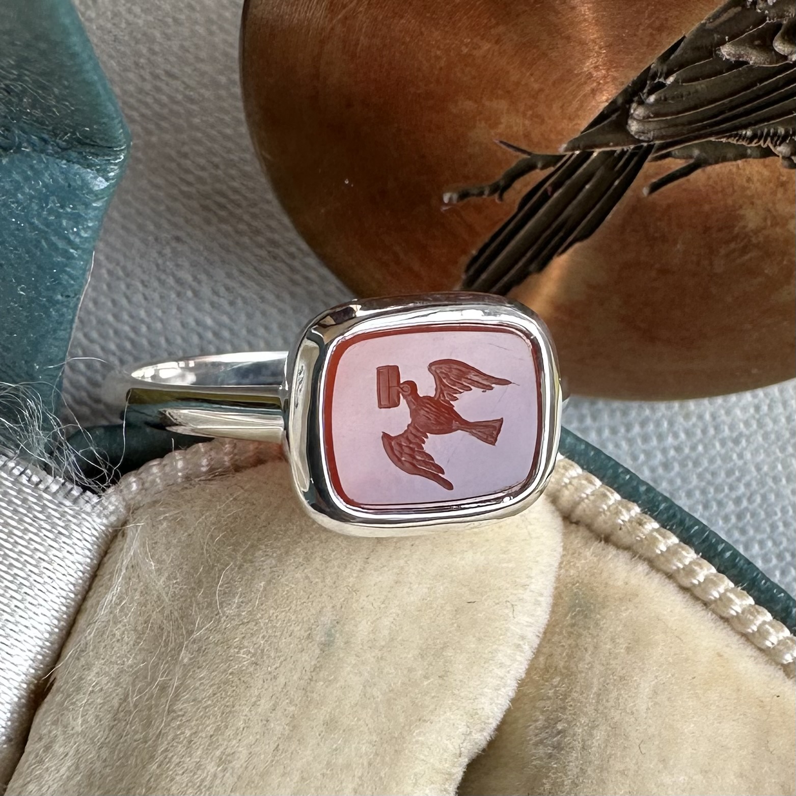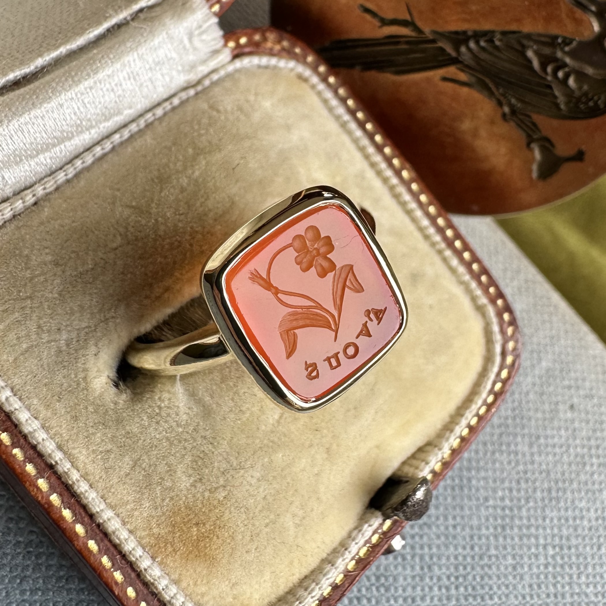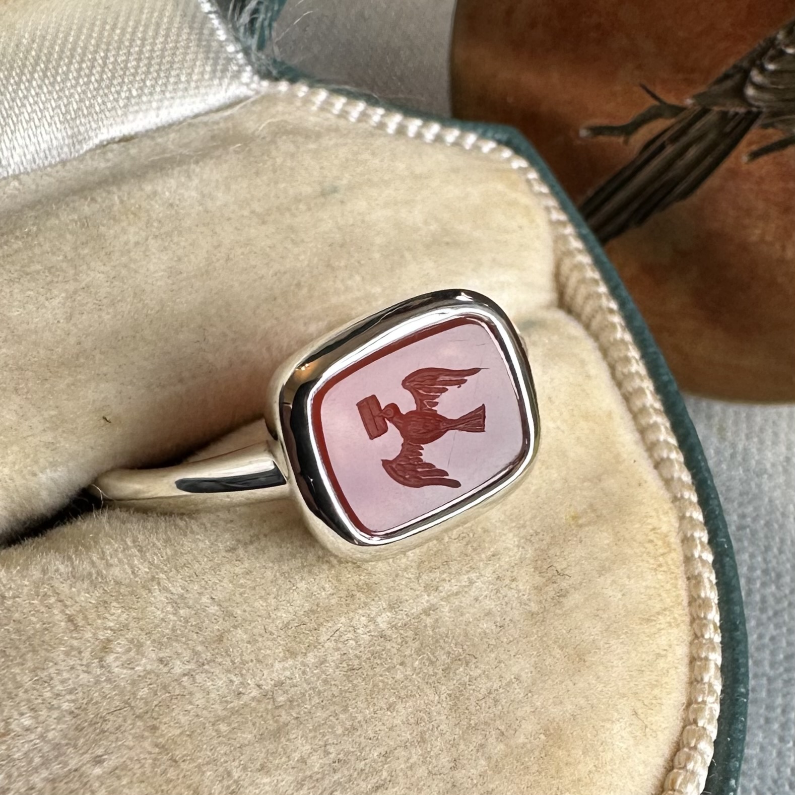 It is important to note that the term dainty was originally coined with reference to the minimalist gold bezel of gold and not to the size of finished piece itself. So dainty setting would have been a much better moniker because it is perfectly possible to have a dainty ring featuring a whacking great intaglio that is quite the finger covering statement piece. Emma didn’t think that through when she named them did she?!