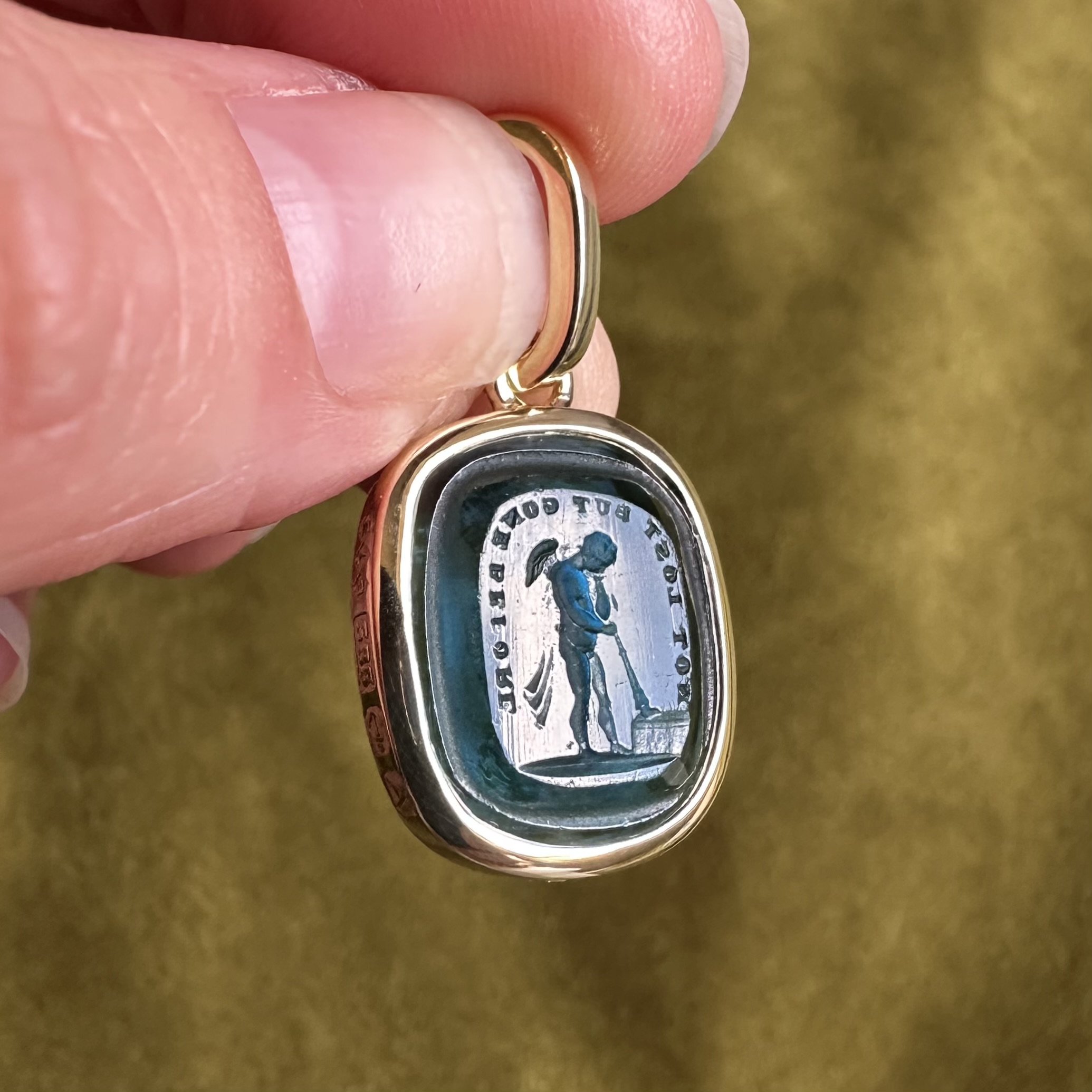 The phrase ‘Not lost but gone before’ is commonly found on antique mourning jewellery from the Georgian and Victorian eras, particularly lockets and rings. It was seen as a comforting expression of remembrance and a way to publicly display grief and respect for the deceased. The phrase is occasionally found on antique wax seals where it would have been used for expressing condolences and remembrance on correspondence. We re-imagined this special Tassie seal into a wearable piece of talisman jewelry for today by setting it as a Classic Intaglio Pendant for our client.